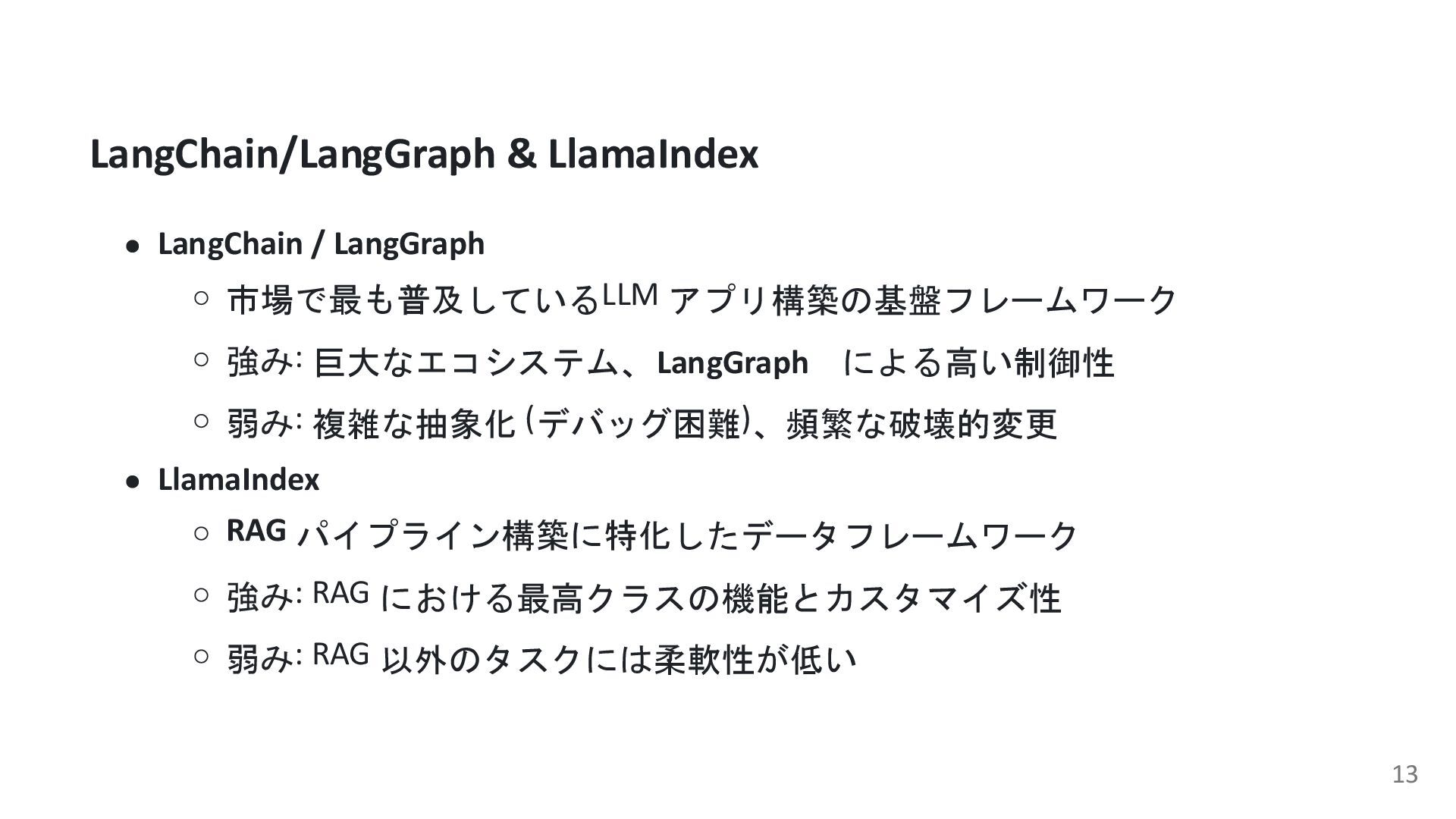 10. LangChain/LangGraph & LlamaIndex LangChain / LangGraph 市場で最も普及しているLLM アプリ構築の基盤フレームワーク 強み: 巨大なエコシステム、LangGraph