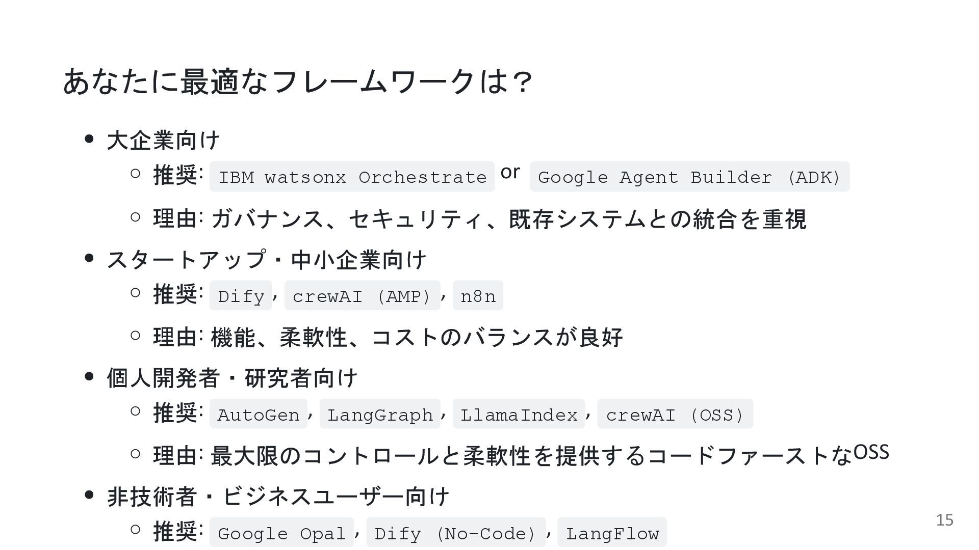 (ADK) 理由: ガバナンス、セキュリティ、既存システムとの統合を重視 スタートアップ・中小企業向け 推奨: Dify , crewAI (AMP) , n8n 理由: 機能、柔軟性、コストのバランスが良好 個人開発者・研究者向け 推奨: AutoGen , LangGraph , LlamaIndex , crewAI (OSS) 理由: 最大限のコントロールと柔軟性を提供するコードファーストなOSS 非技術者・ビジネスユーザー向け 推奨: Google Opal , Dify (No-Code) , LangFlow 15