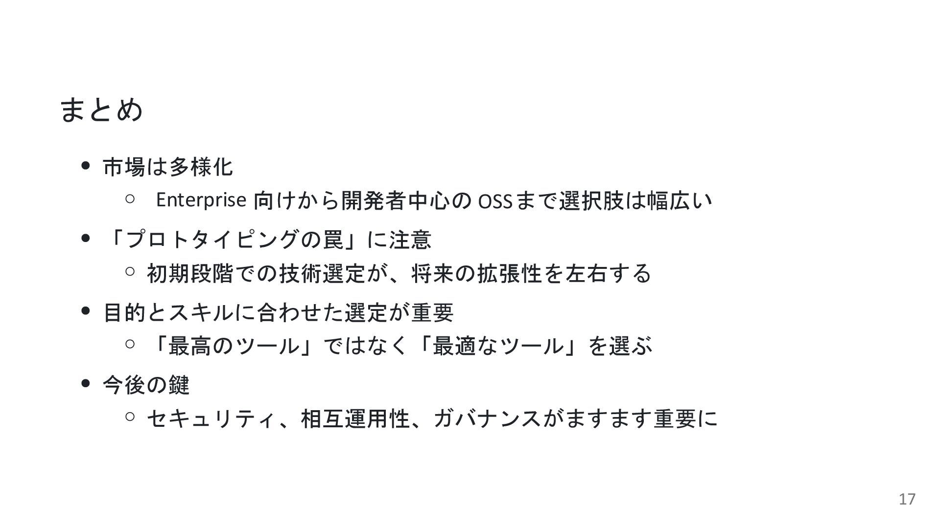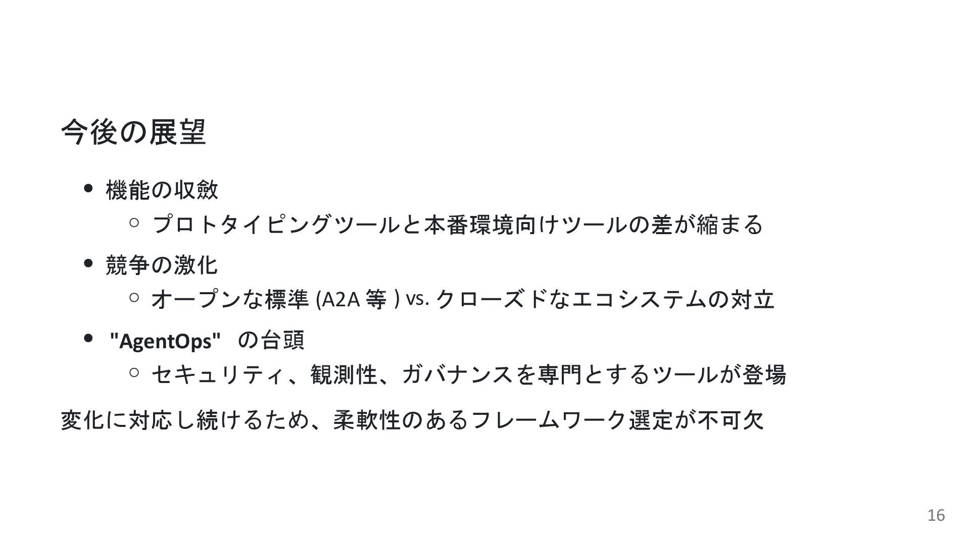 "AgentOps" の台頭 セキュリティ、観測性、ガバナンスを専門とするツールが登場 変化に対応し続けるため、柔軟性のあるフレームワーク選定が不可欠 16