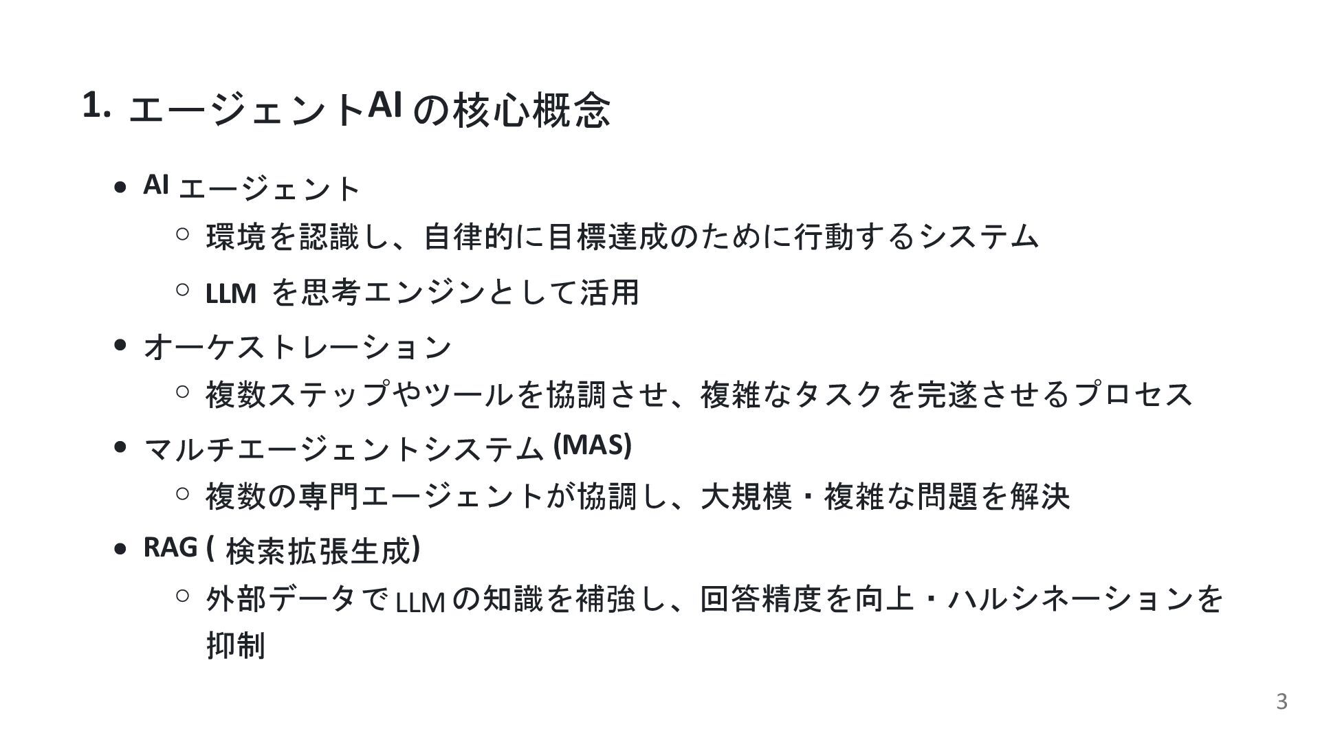 2. 1. エージェントAI の核心概念 AI エージェント 環境を認識し、自律的に目標達成のために行動するシステム LLM を思考エンジンとして活用 オーケストレーション 複数ステップやツールを協調させ、複雑なタスクを完遂させるプロセス