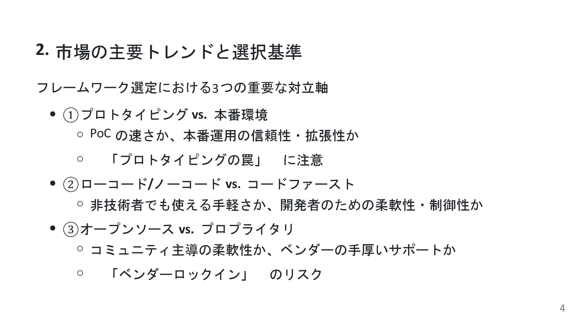 3. 2. 市場の主要トレンドと選択基準 フレームワーク選定における3つの重要な対立軸 ①プロトタイピング vs. 本番環境 PoC の速さか、本番運用の信頼性・拡張性か 「プロトタイピングの罠」 に注意