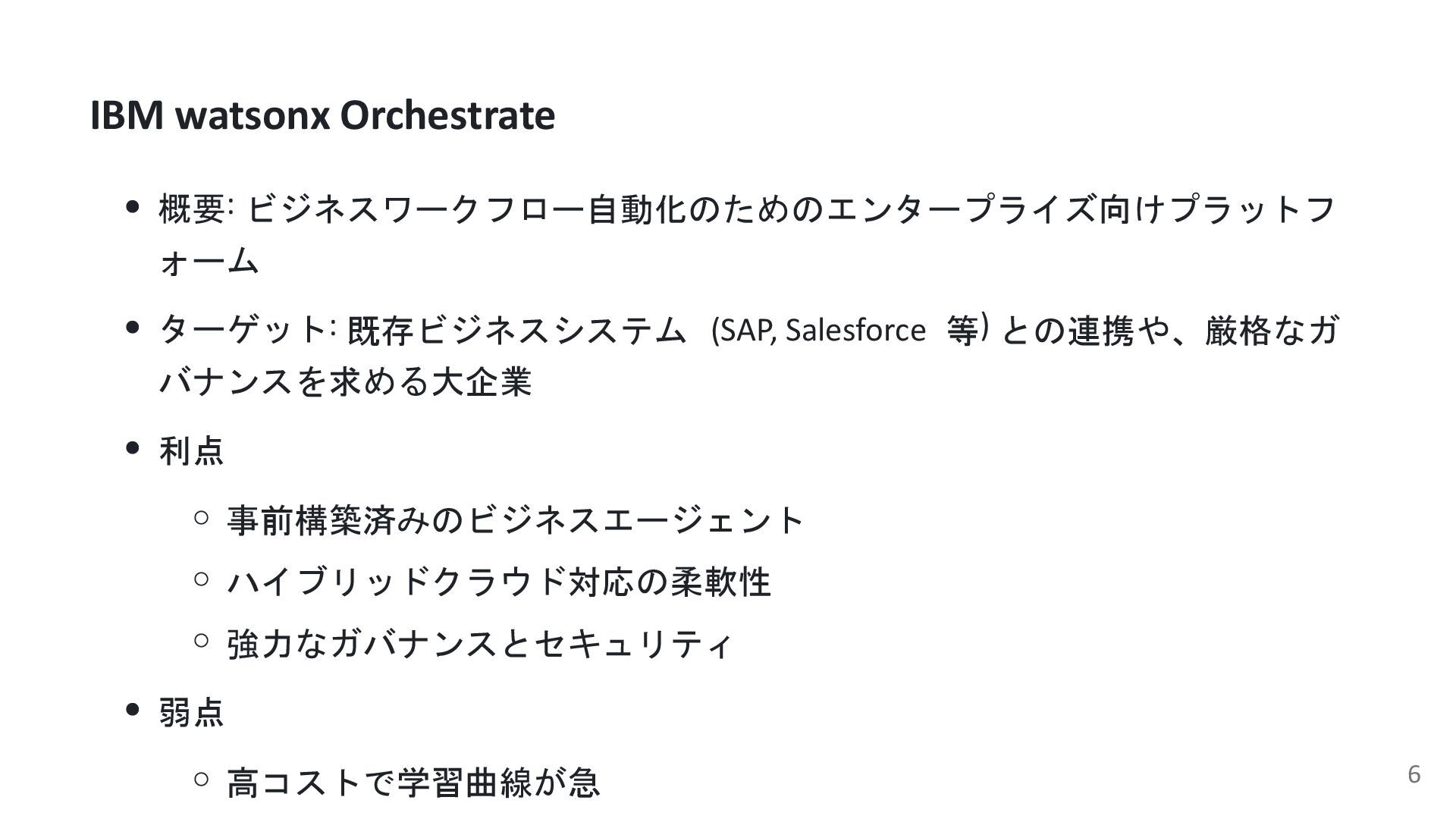 等) との連携や、厳格なガ バナンスを求める大企業 利点 事前構築済みのビジネスエージェント ハイブリッドクラウド対応の柔軟性 強力なガバナンスとセキュリティ 弱点 高コストで学習曲線が急 6
