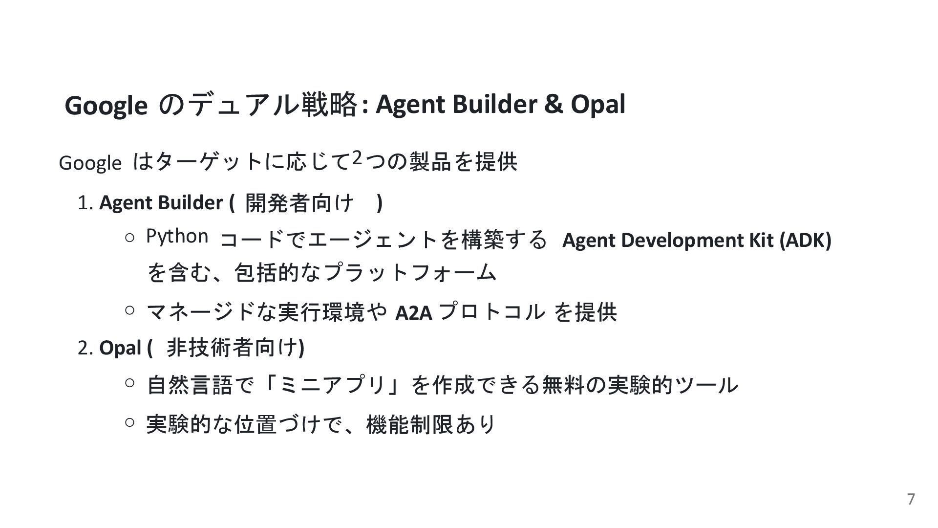 5. Google のデュアル戦略: Agent Builder & Opal Google はターゲットに応じて2つの製品を提供 1. Agent