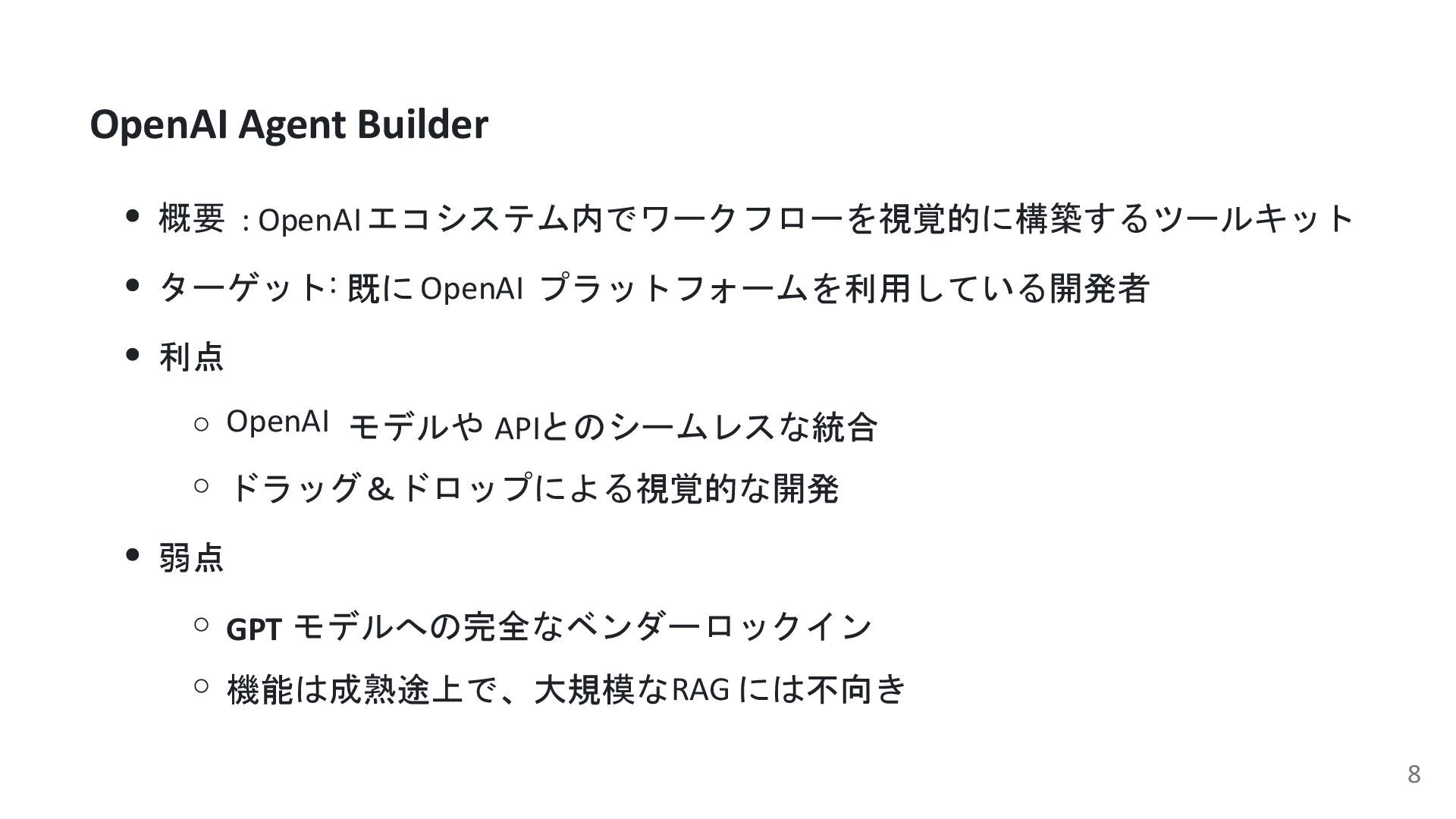 利点 OpenAI モデルや APIとのシームレスな統合 ドラッグ&ドロップによる視覚的な開発 弱点 GPT モデルへの完全なベンダーロックイン 機能は成熟途上で、大規模なRAG には不向き 8