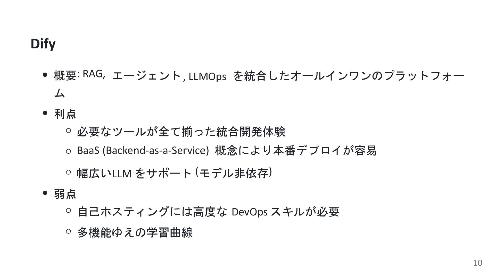 (Backend-as-a-Service) 概念により本番デプロイが容易 幅広いLLM をサポート (モデル非依存) 弱点 自己ホスティングには高度な DevOps スキルが必要 多機能ゆえの学習曲線 10