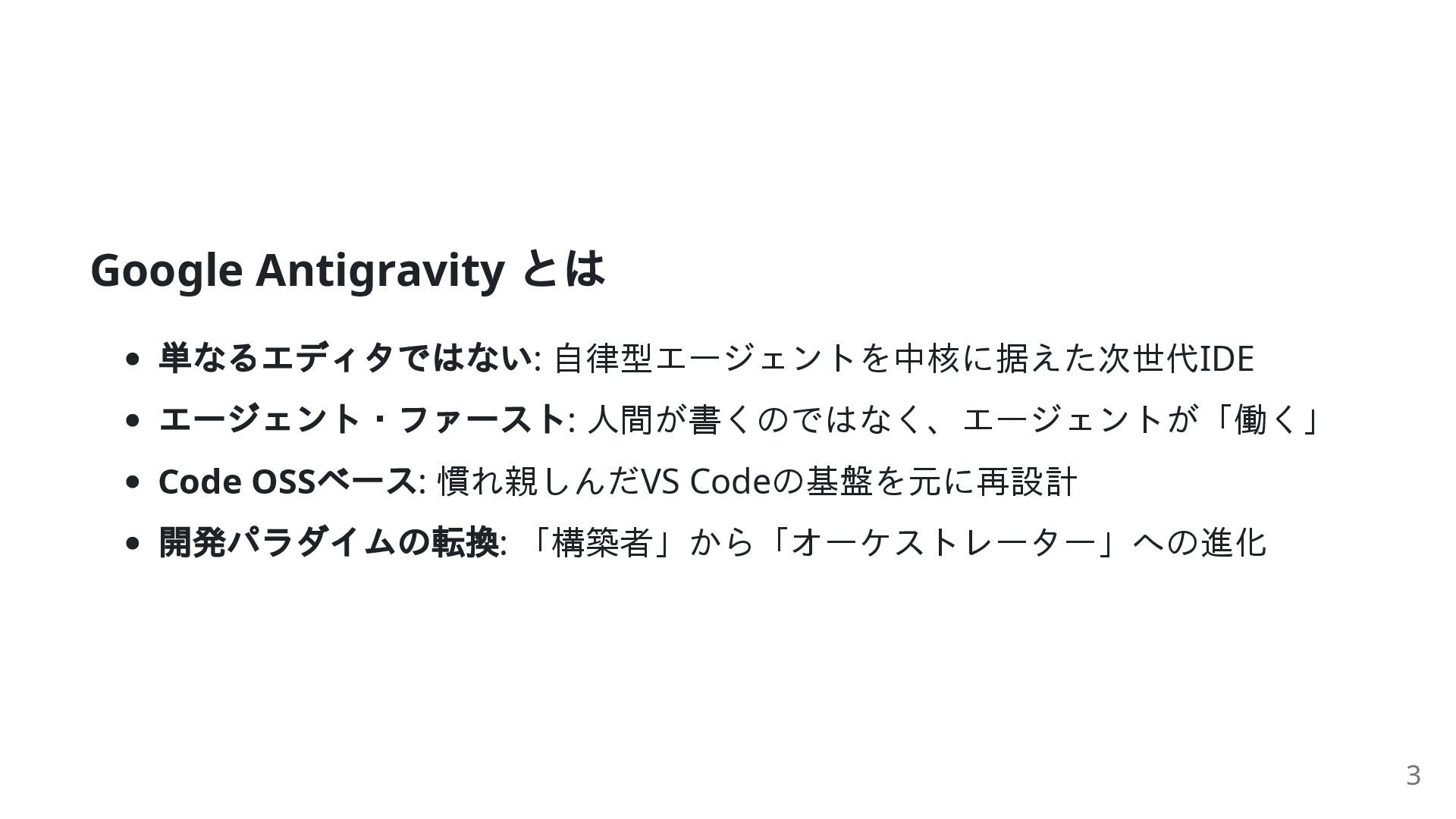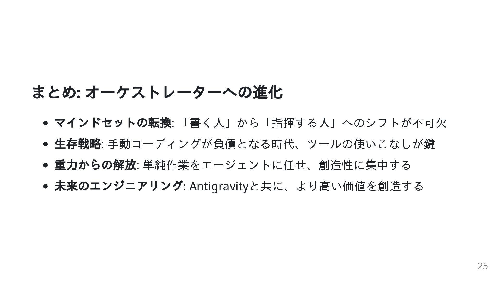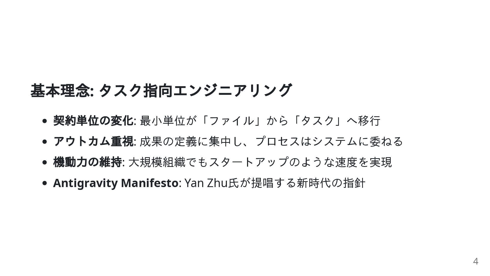 現代のソフトウェア開発が抱える「重力」 システムの巨大化: 複雑さが人間の認知能力を超えつつある 技術的負債: 膨大な既存コードが開発速度を低下させる「重力」となる 従来手法の限界: 一行ずつコードを書くスタイルでは、もはや対応しきれない 危機の時代: エンジニアリングのやり方そのものを変える必要がある