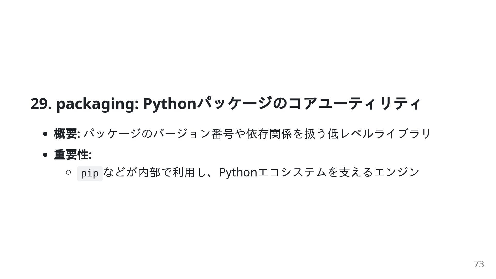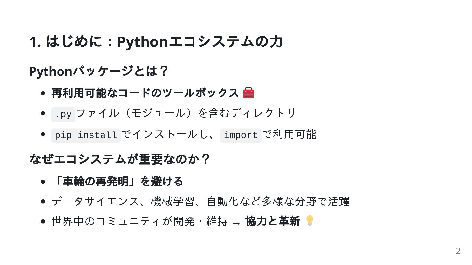 1. 1. はじめに:Python エコシステムの力 Python パッケージとは? 再利用可能なコードのツールボックス .py ファイル(モジュール)を含むディレクトリ pip install