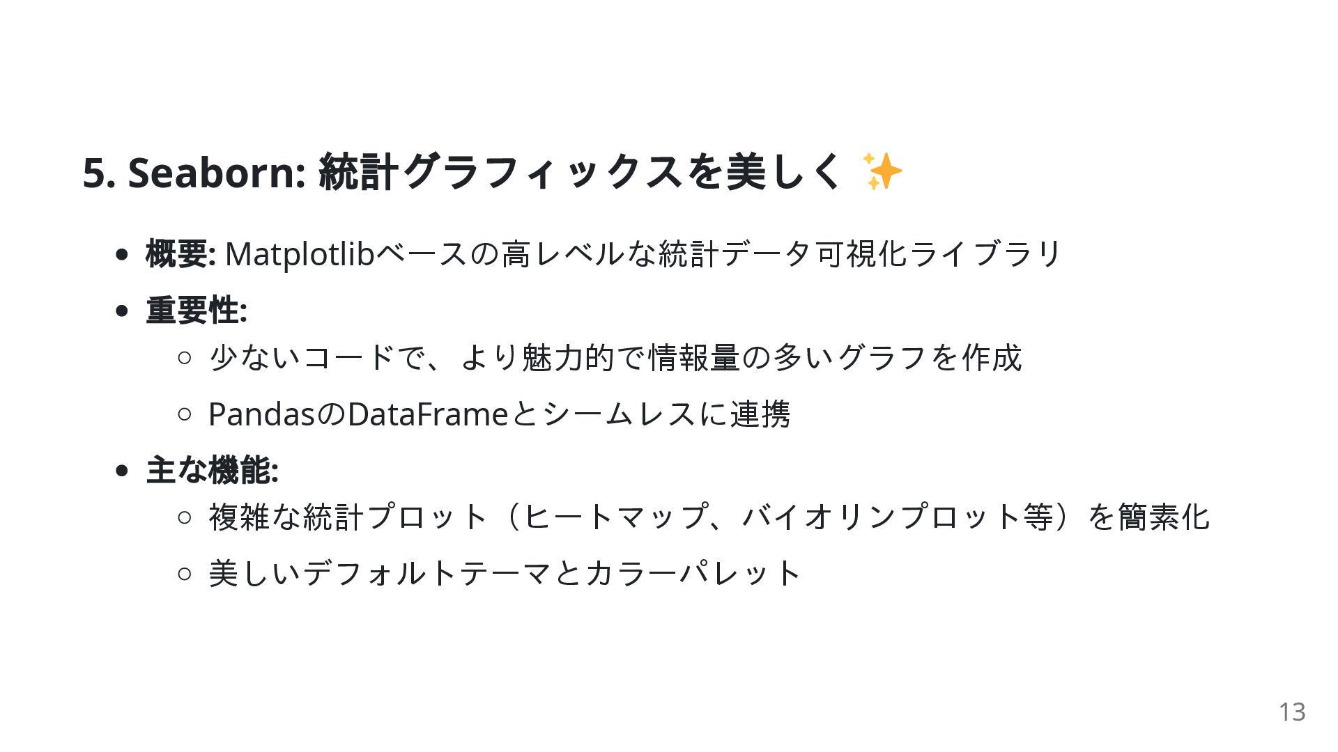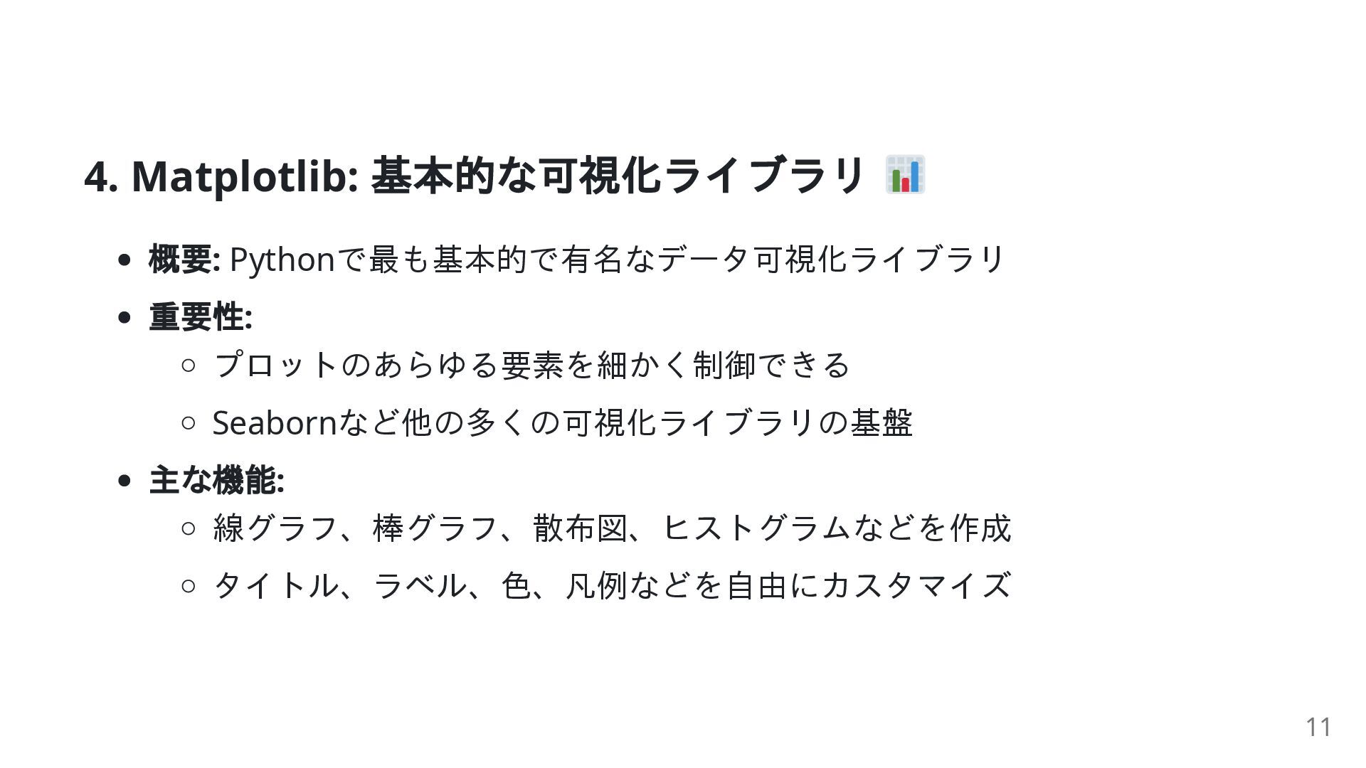 9. Matplotlib vs Seaborn 比較表 特徴 Matplotlib Seaborn 主な用途 基本的で汎用的な描画 高レベルな統計データの可視化