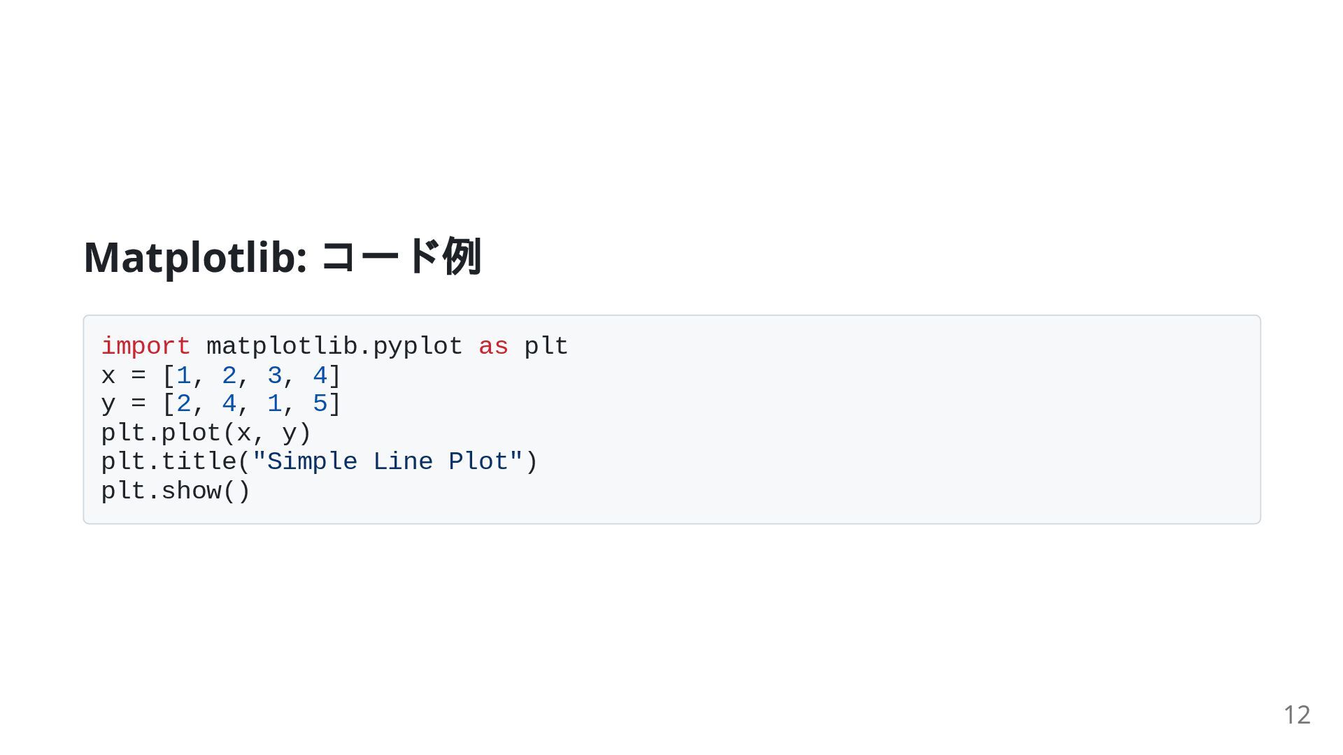 7. Matplotlib: コード例 import matplotlib.pyplot as plt x = [1, 2,