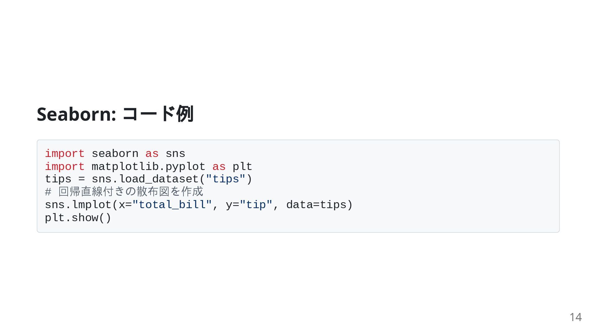 8. Seaborn: コード例 import seaborn as sns import matplotlib.pyplot as plt