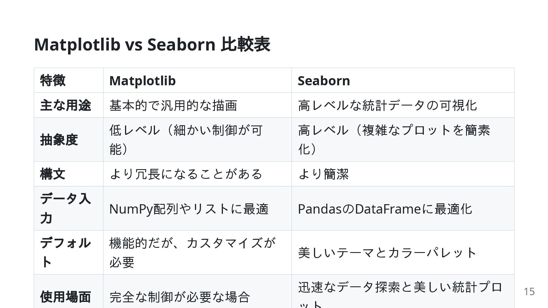 抽象度 低レベル(細かい制御が可 能) 高レベル(複雑なプロットを簡素 化) 構文 より冗長になることがある より簡潔 データ入 力 NumPy配列やリストに最適 PandasのDataFrameに最適化 デフォル ト 機能的だが、カスタマイズが 必要 美しいテーマとカラーパレット 使用場面 完全な制御が必要な場合 迅速なデータ探索と美しい統計プロ 15