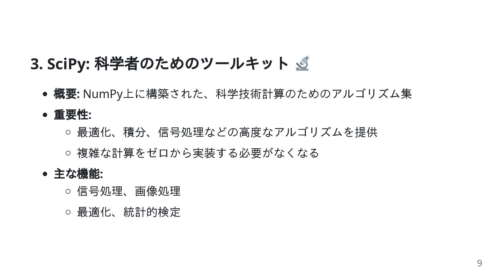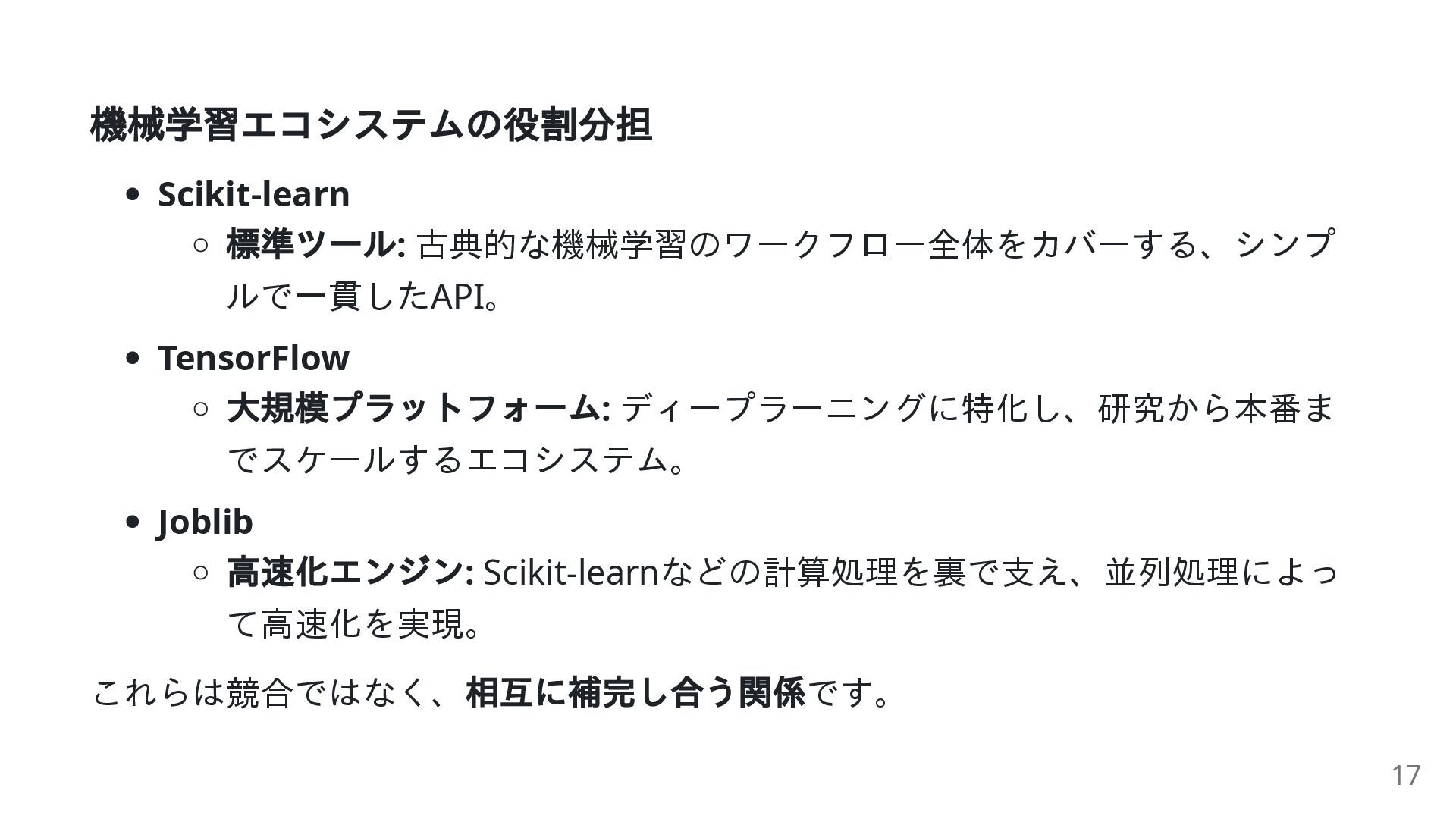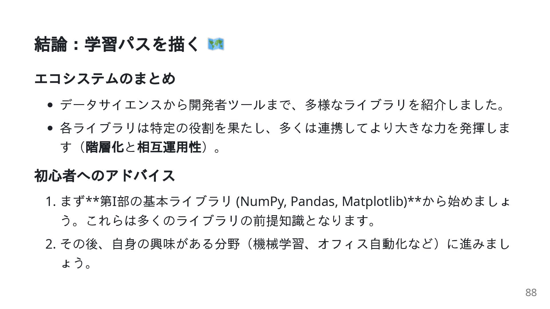 でインストールし、 import で利用可能 なぜエコシステムが重要なのか? 「車輪の再発明」を避ける データサイエンス、機械学習、自動化など多様な分野で活躍 世界中のコミュニティが開発・維持 → 協力と革新 2