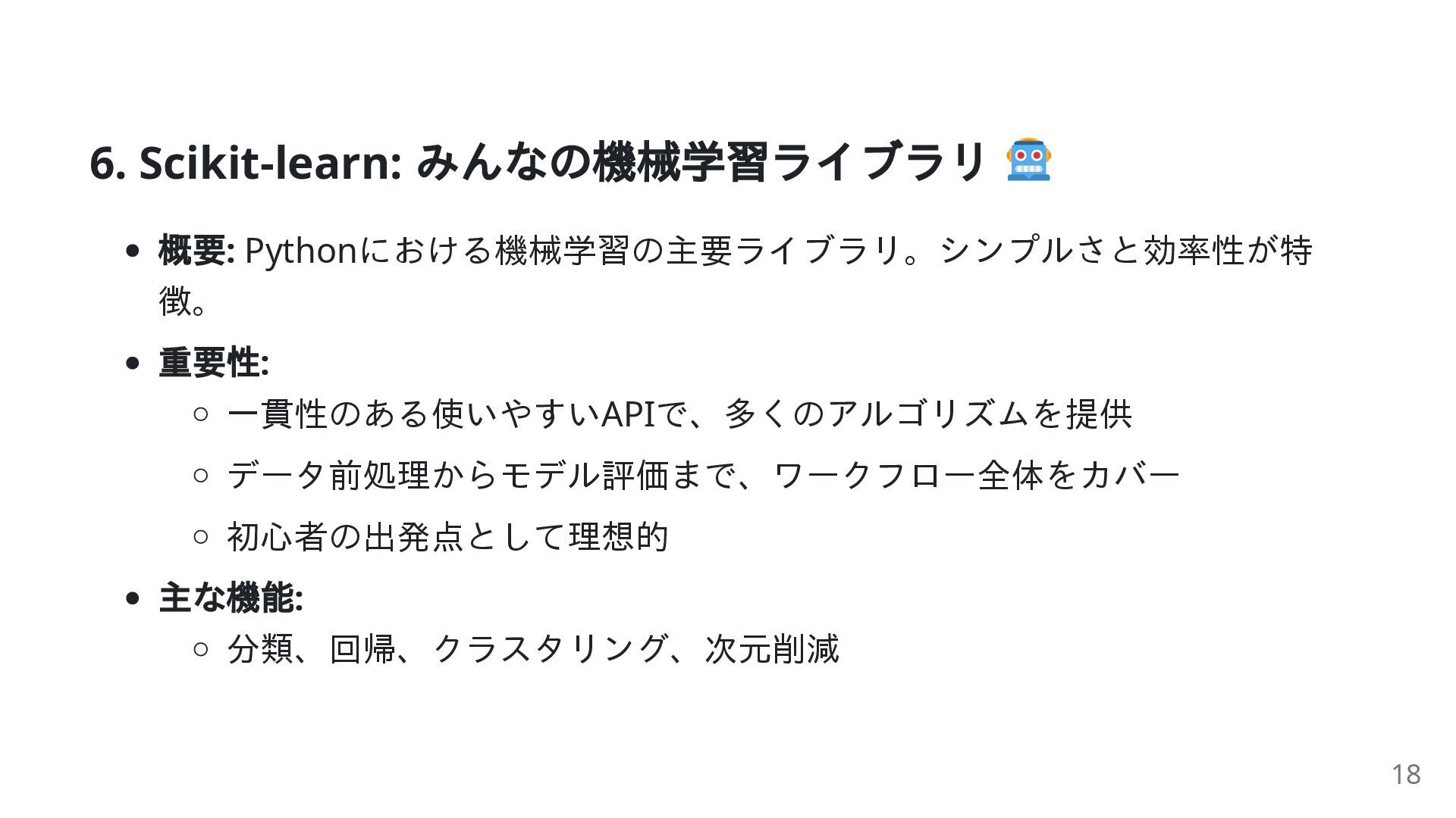 11. 7. TensorFlow: ディープラーニングの原動力 概要: Google製の、特にディープラーニングのための大規模機械学習ライブラ リ 重要性: 大規模なモデルの構築と展開のための包括的なエコシステム CPU, GPU,