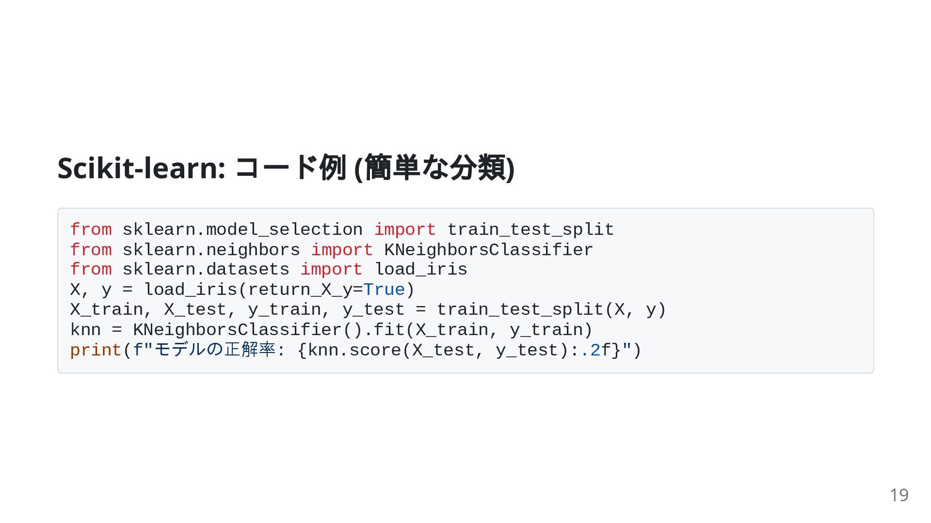 import KNeighborsClassifier from sklearn.datasets import load_iris X, y = load_iris(return_X_y=True) X_train, X_test, y_train, y_test = train_test_split(X, y) knn = KNeighborsClassifier().fit(X_train, y_train) print(f"モデルの正解率: {knn.score(X_test, y_test):.2f}") 19