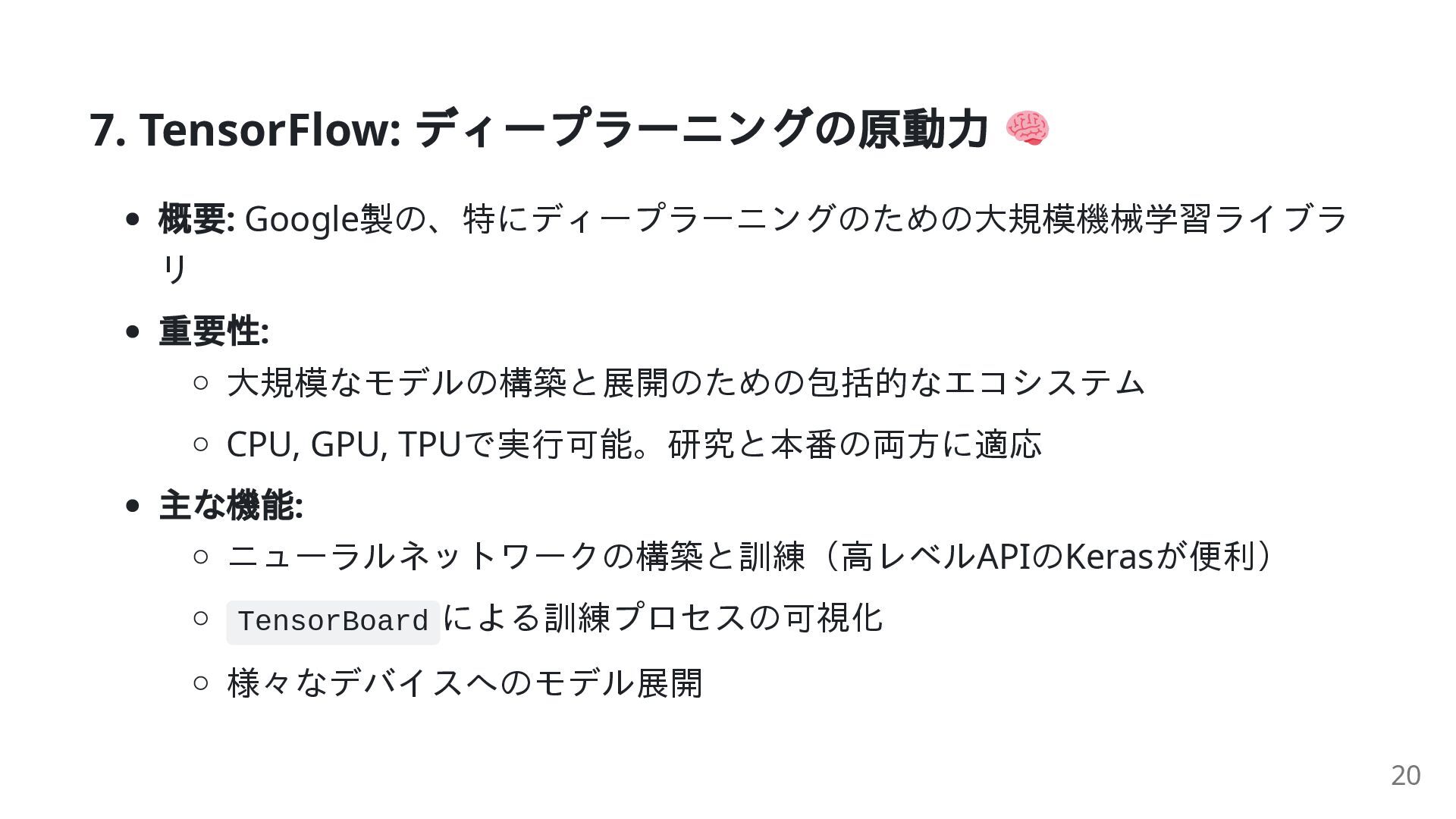 TPUで実行可能。研究と本番の両方に適応 主な機能: ニューラルネットワークの構築と訓練(高レベルAPIのKerasが便利) TensorBoard による訓練プロセスの可視化 様々なデバイスへのモデル展開 20