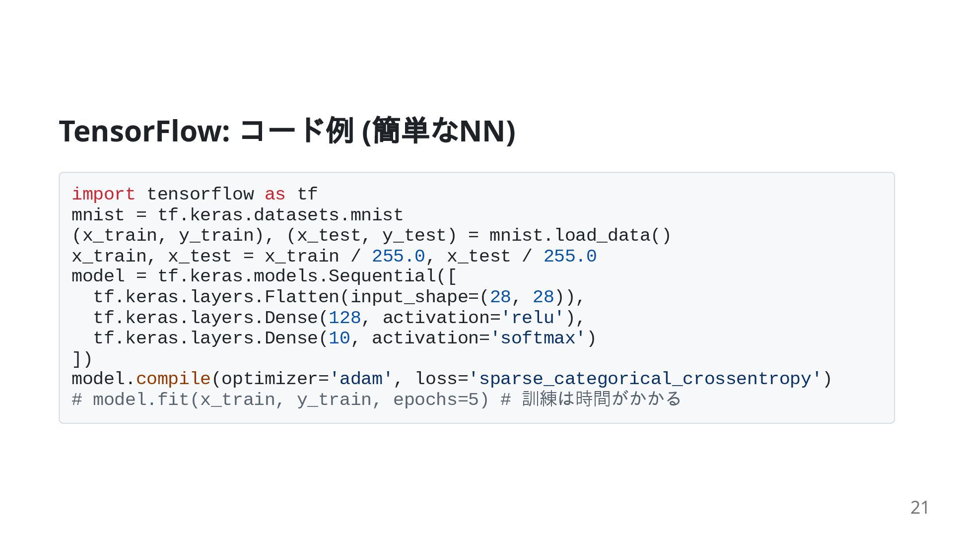 tf.keras.datasets.mnist (x_train, y_train), (x_test, y_test) = mnist.load_data() x_train, x_test = x_train / 255.0, x_test / 255.0 model = tf.keras.models.Sequential([ tf.keras.layers.Flatten(input_shape=(28, 28)), tf.keras.layers.Dense(128, activation='relu'), tf.keras.layers.Dense(10, activation='softmax') ]) model.compile(optimizer='adam', loss='sparse_categorical_crossentropy') # model.fit(x_train, y_train, epochs=5) # 訓練は時間がかかる 21