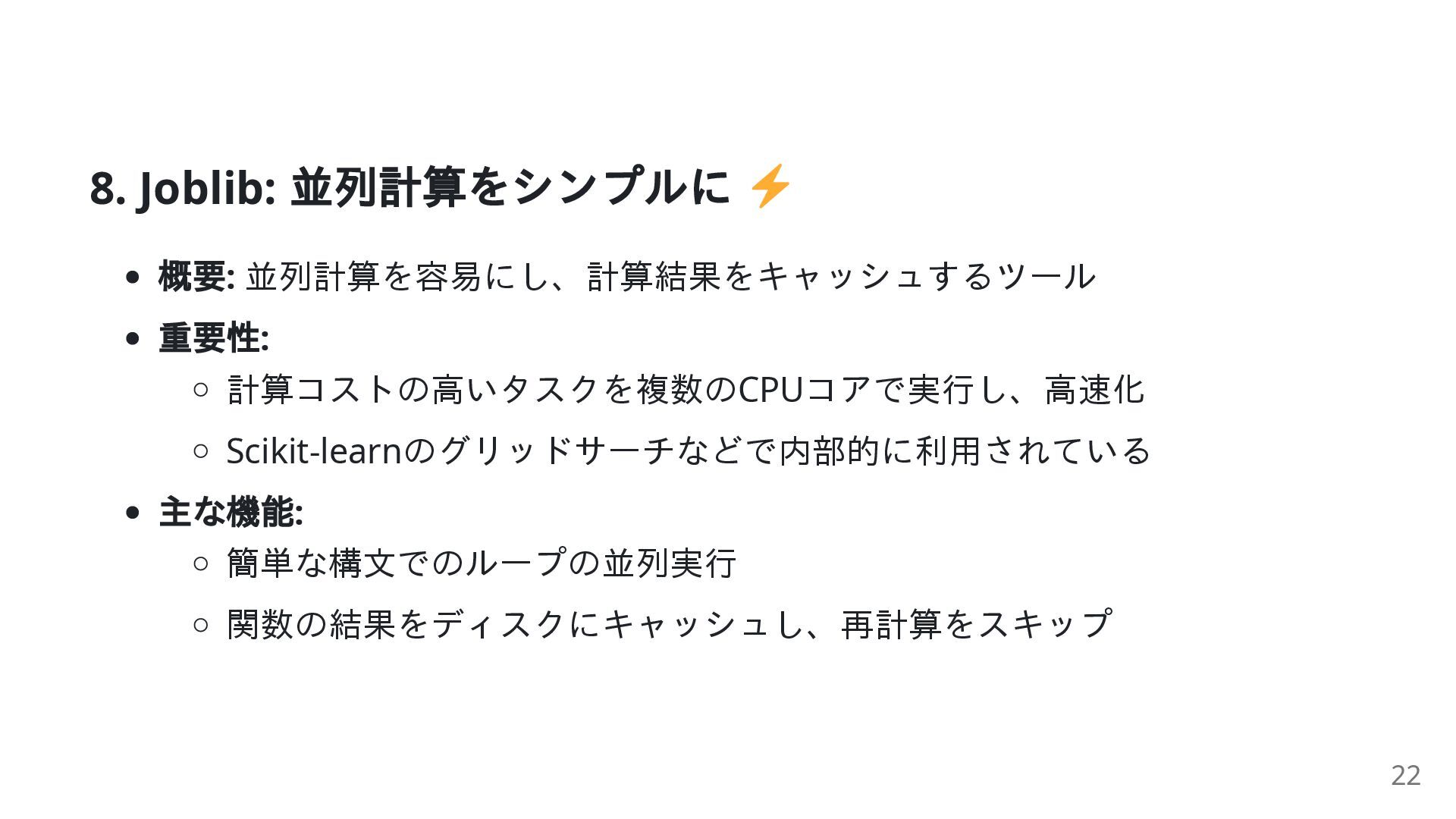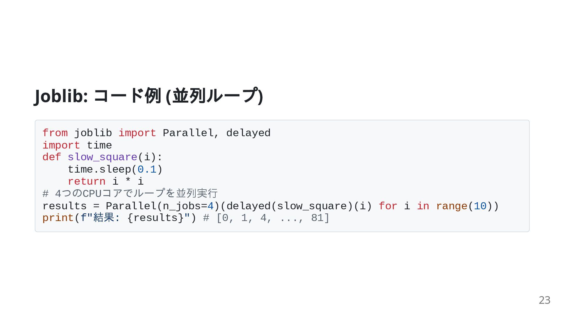 time def slow_square(i): time.sleep(0.1) return i * i # 4つのCPUコアでループを並列実行 results = Parallel(n_jobs=4)(delayed(slow_square)(i) for i in range(10)) print(f"結果: {results}") # [0, 1, 4, ..., 81] 23