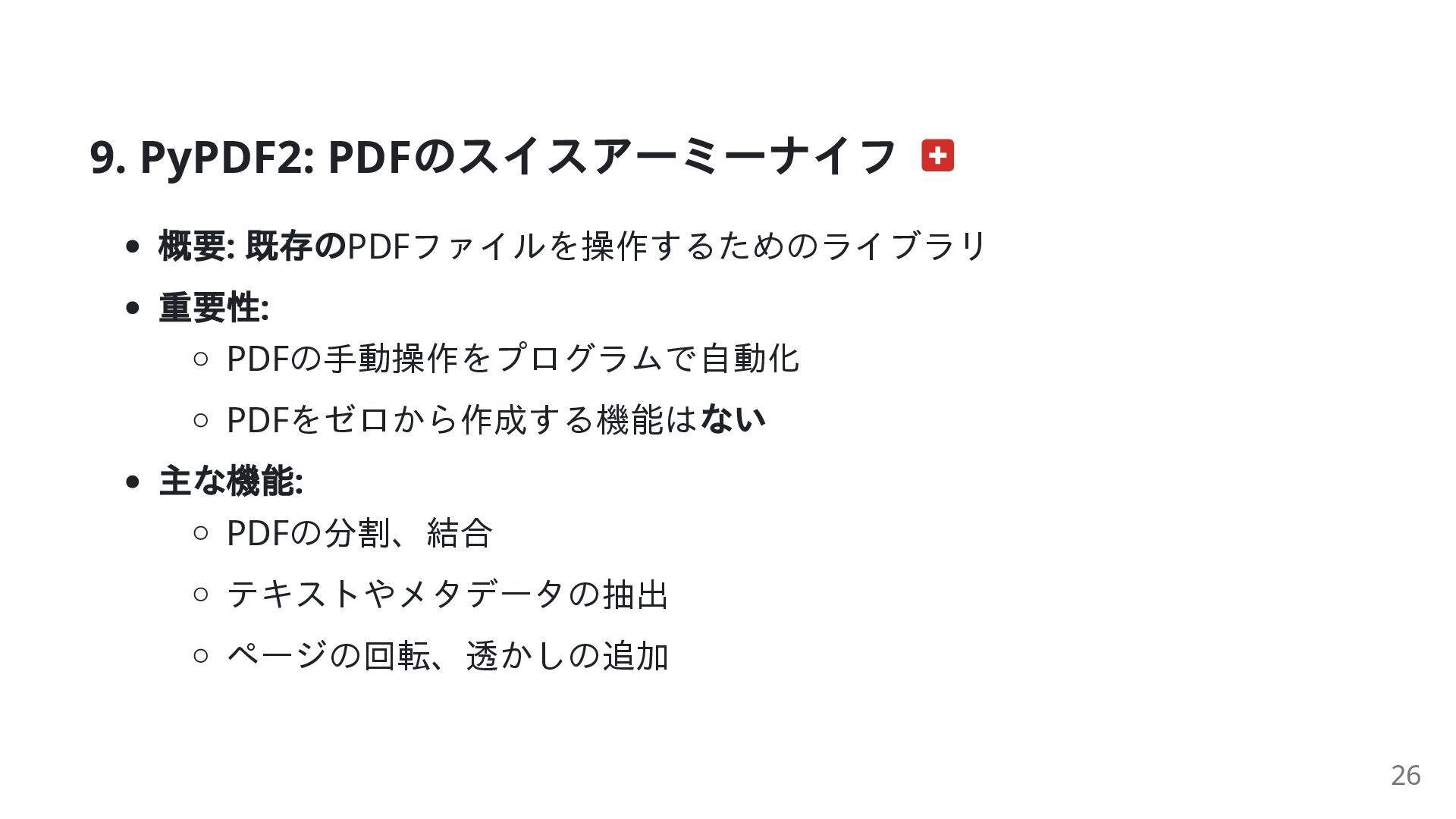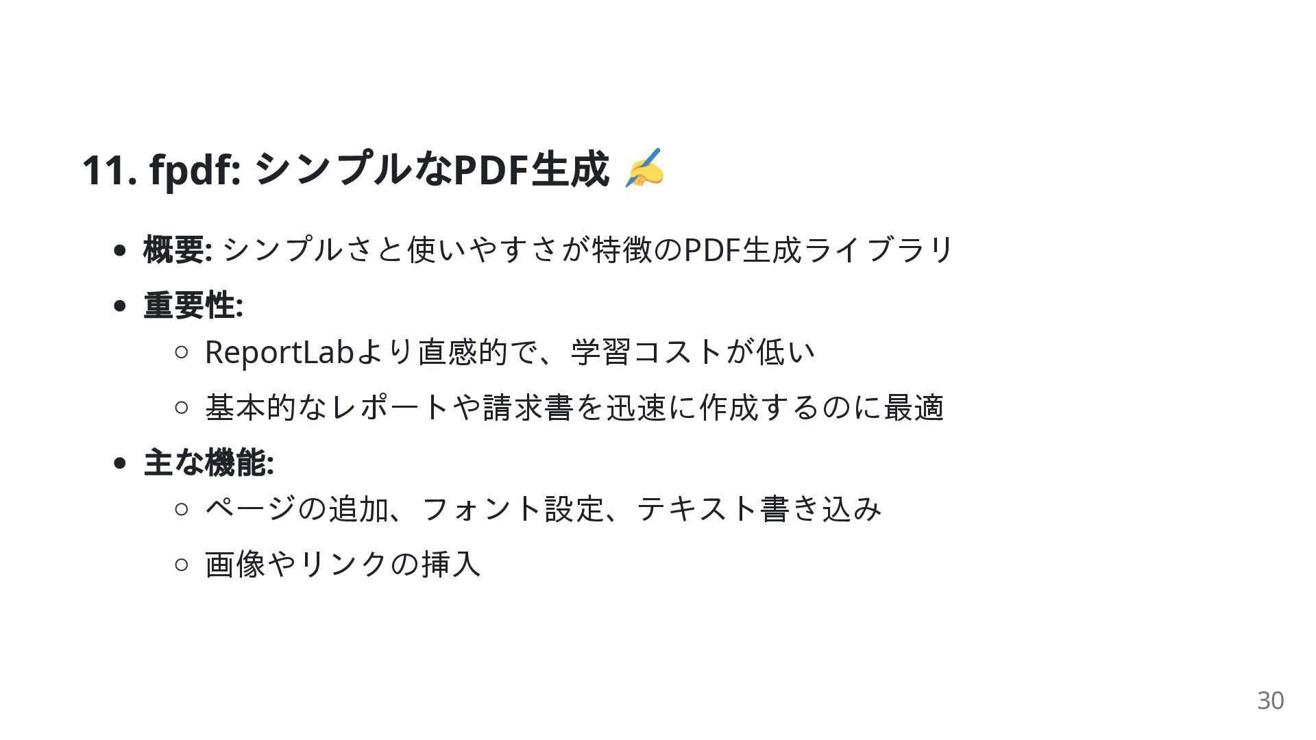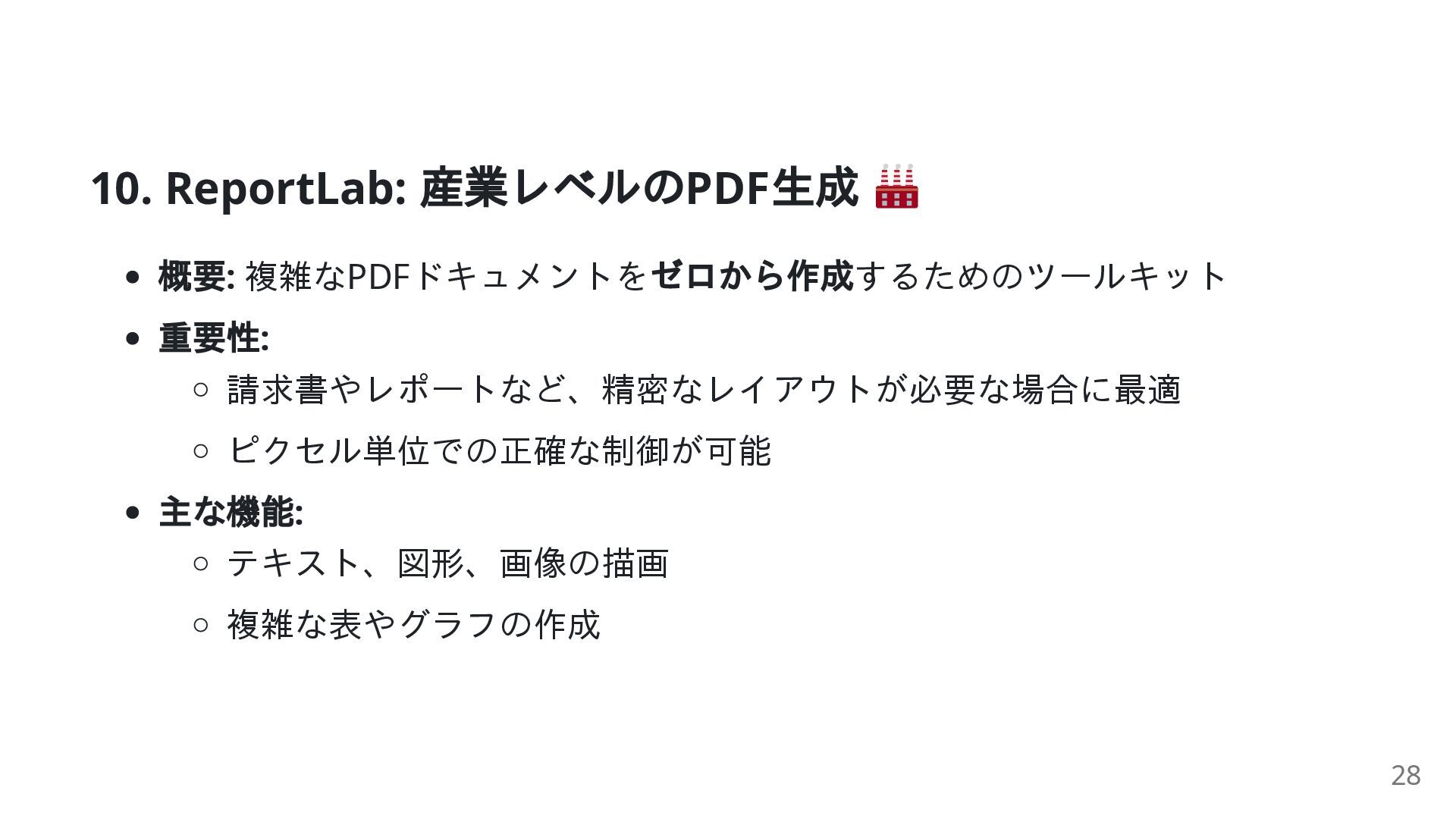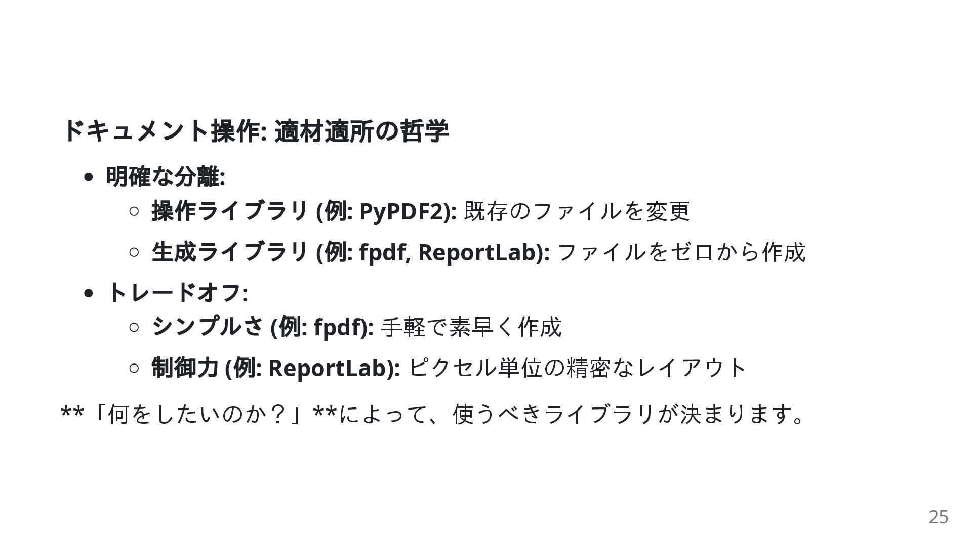 例: fpdf, ReportLab): ファイルをゼロから作成 トレードオフ: シンプルさ ( 例: fpdf): 手軽で素早く作成 制御力 ( 例: ReportLab): ピクセル単位の精密なレイアウト **「何をしたいのか?」**によって、使うべきライブラリが決まります。 25