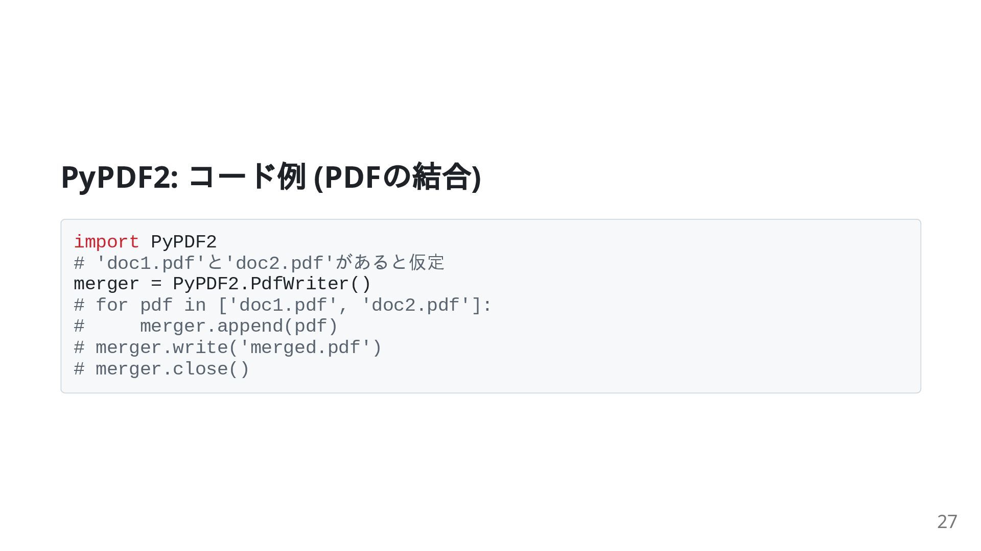 15. PyPDF2: コード例 (PDF の結合) import PyPDF2 # 'doc1.pdf'と'doc2.pdf'があると仮定 merger =