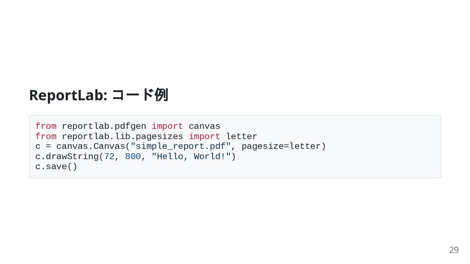 16. ReportLab: コード例 from reportlab.pdfgen import canvas from reportlab.lib.pagesizes import letter