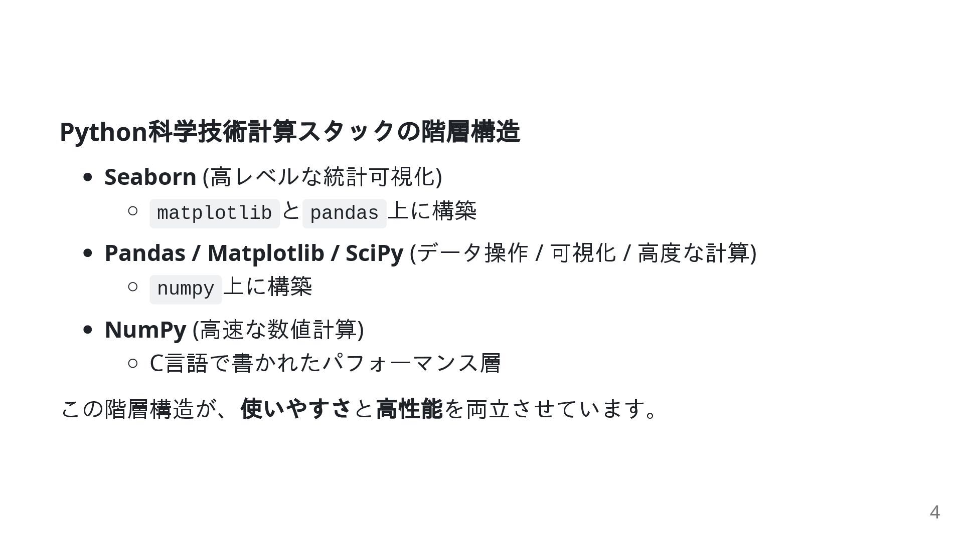 2. Python 科学技術計算スタックの階層構造 Seaborn (高レベルな統計可視化) matplotlib と pandas 上に構築 Pandas /