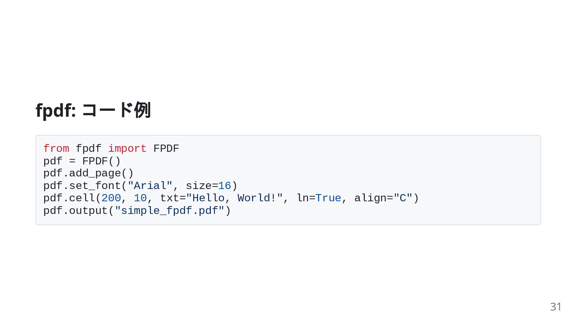pdf.set_font("Arial", size=16) pdf.cell(200, 10, txt="Hello, World!", ln=True, align="C") pdf.output("simple_fpdf.pdf") 31