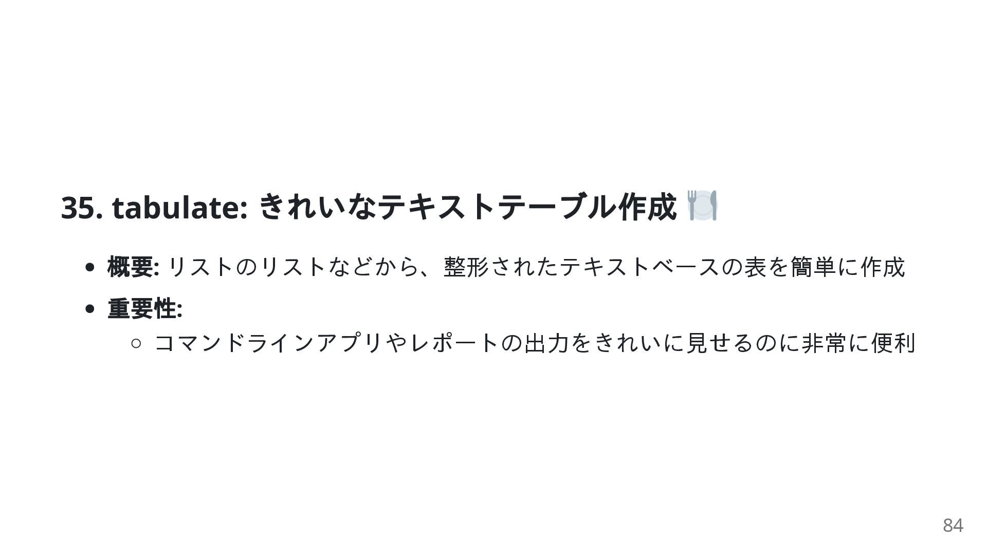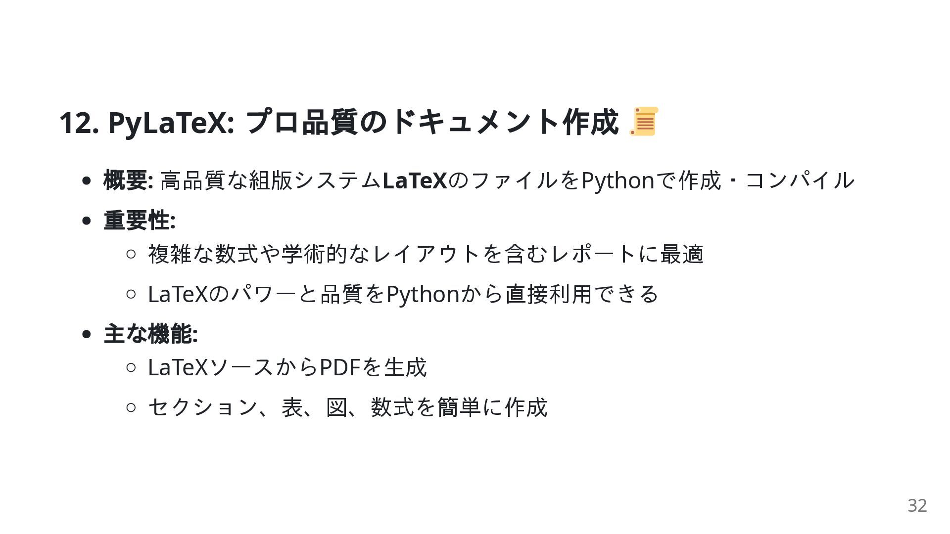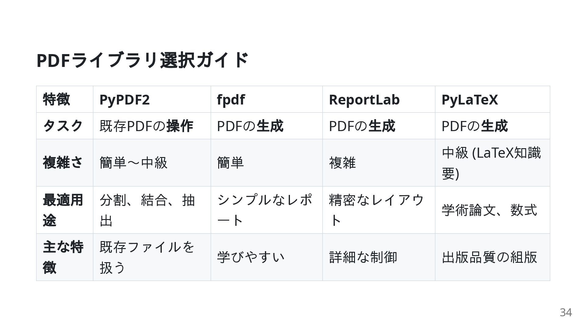 PDFの 生成 PDFの 生成 PDFの 生成 複雑さ 簡単~中級 簡単 複雑 中級 (LaTeX知識 要) 最適用 途 分割、結合、抽 出 シンプルなレポ ート 精密なレイアウ ト 学術論文、数式 主な特 徴 既存ファイルを 扱う 学びやすい 詳細な制御 出版品質の組版 34