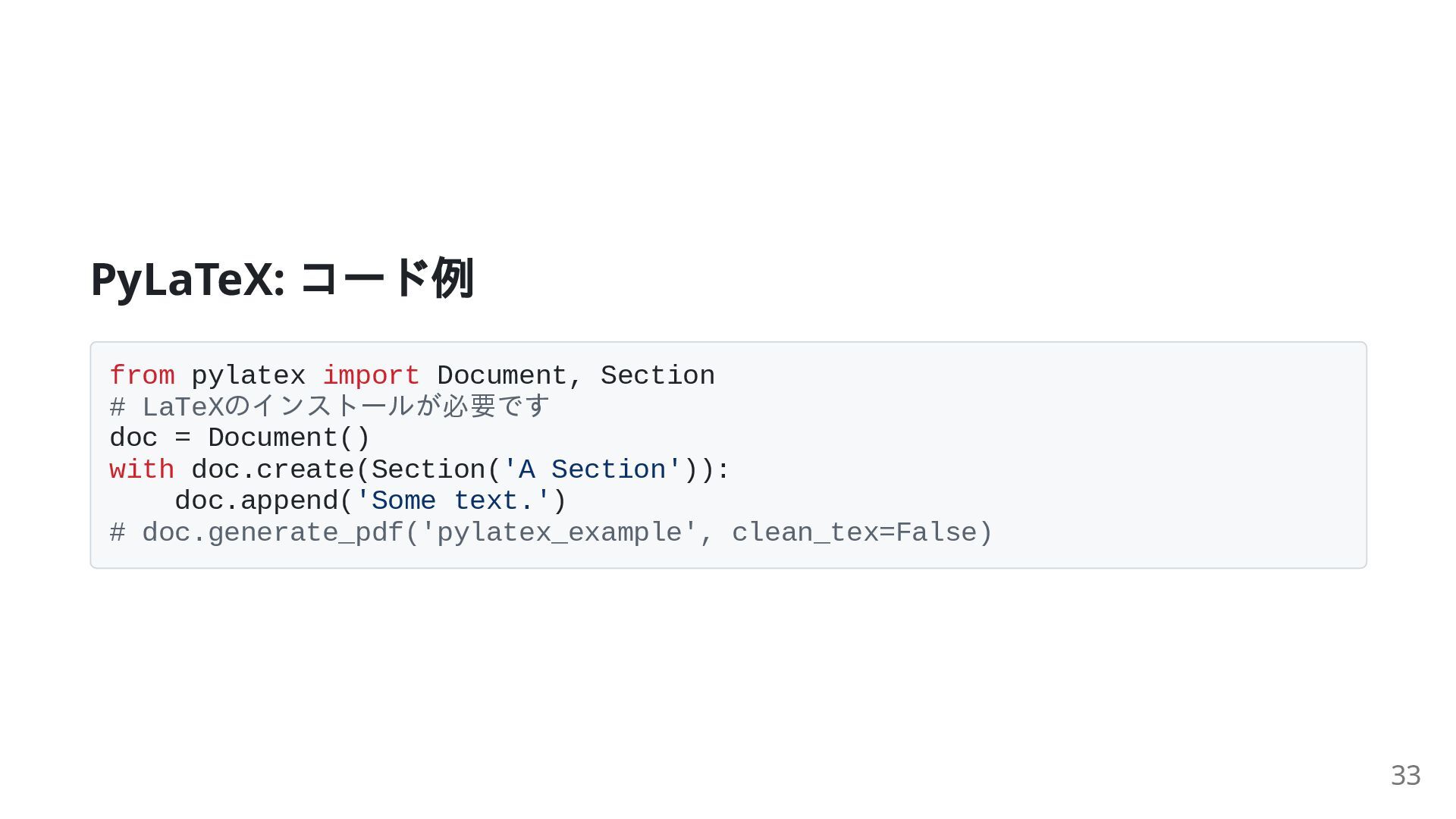 18. PyLaTeX: コード例 from pylatex import Document, Section # LaTeXのインストールが必要です doc