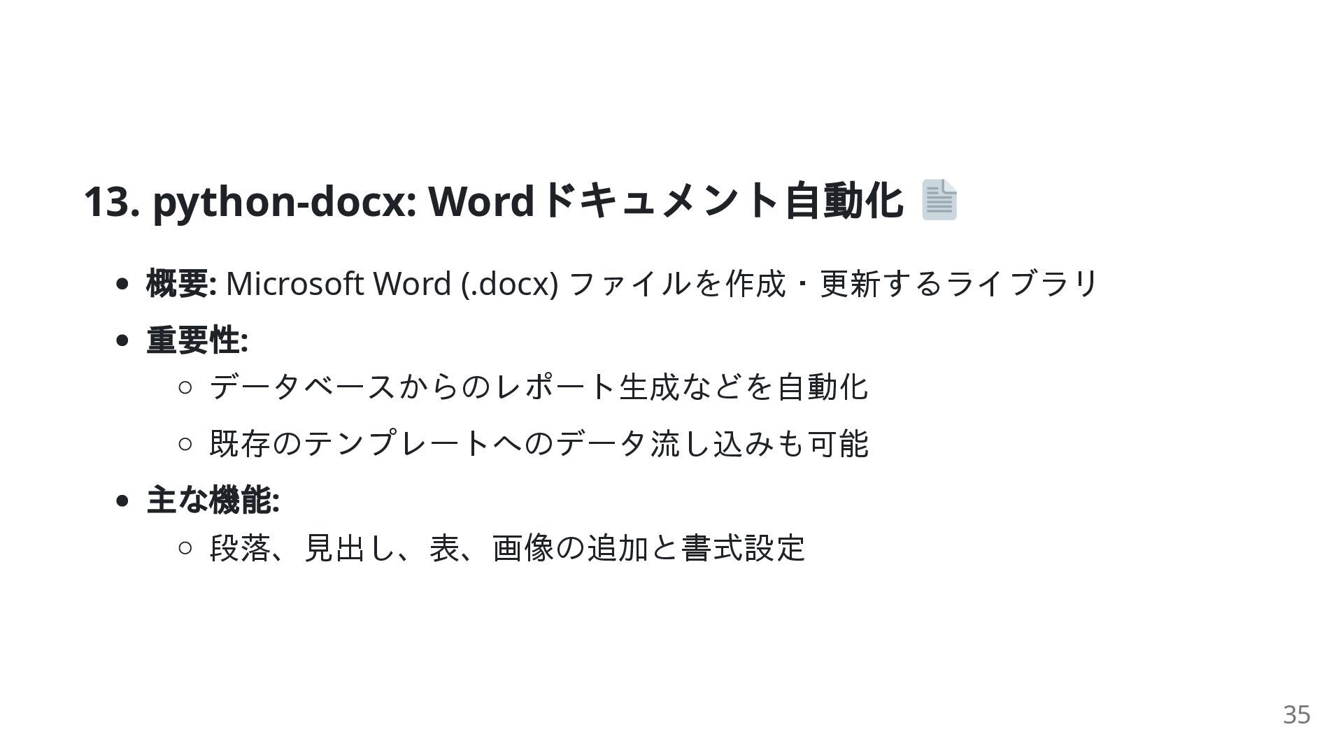 20. 13. python-docx: Word ドキュメント自動化 概要: Microsoft Word (.docx) ファイルを作成・更新するライブラリ 重要性: