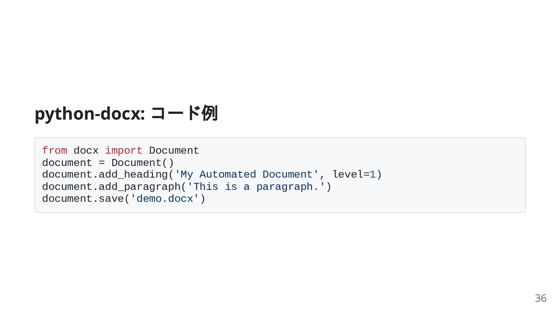 21. python-docx: コード例 from docx import Document document = Document() document.add_heading('My