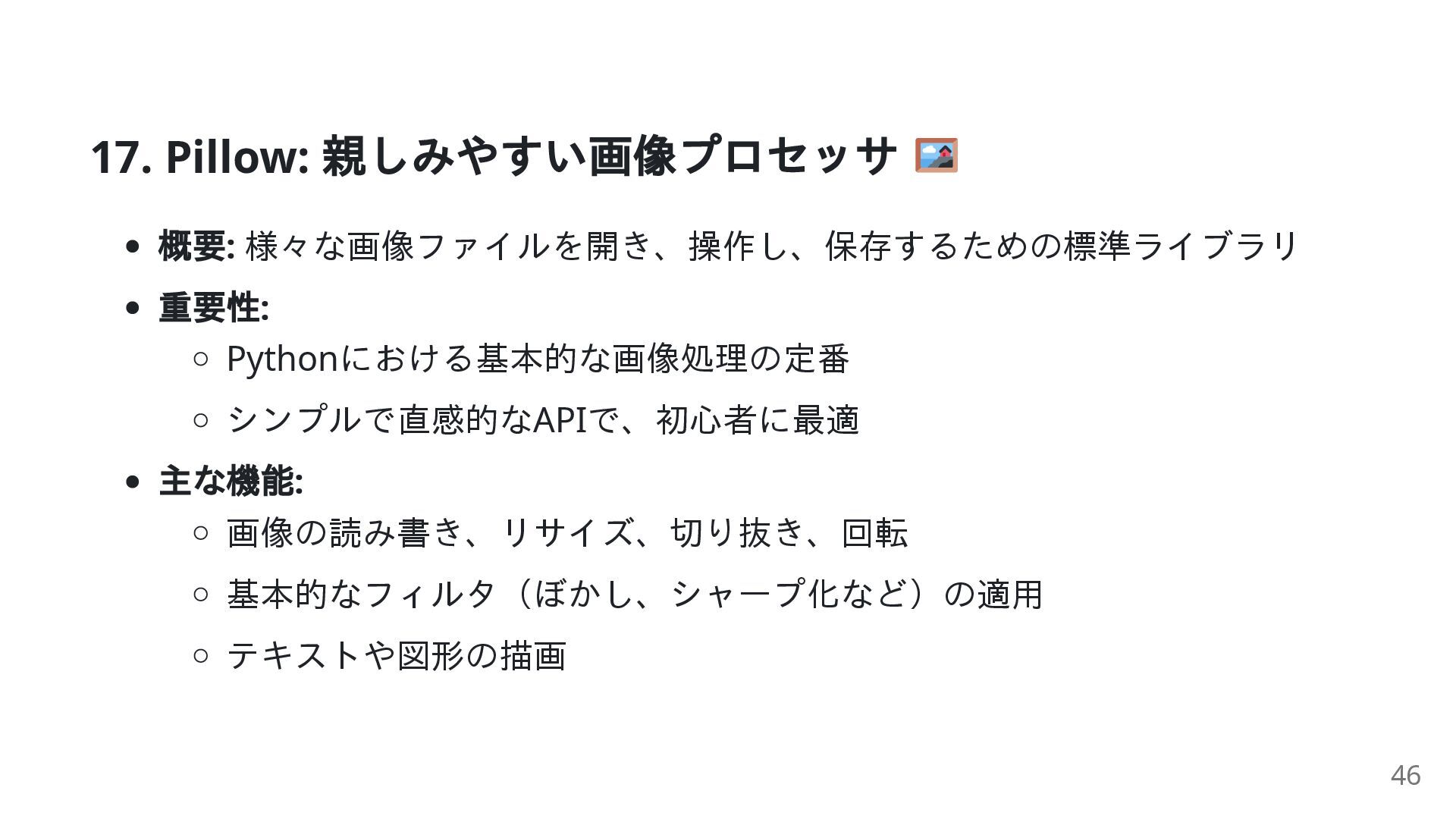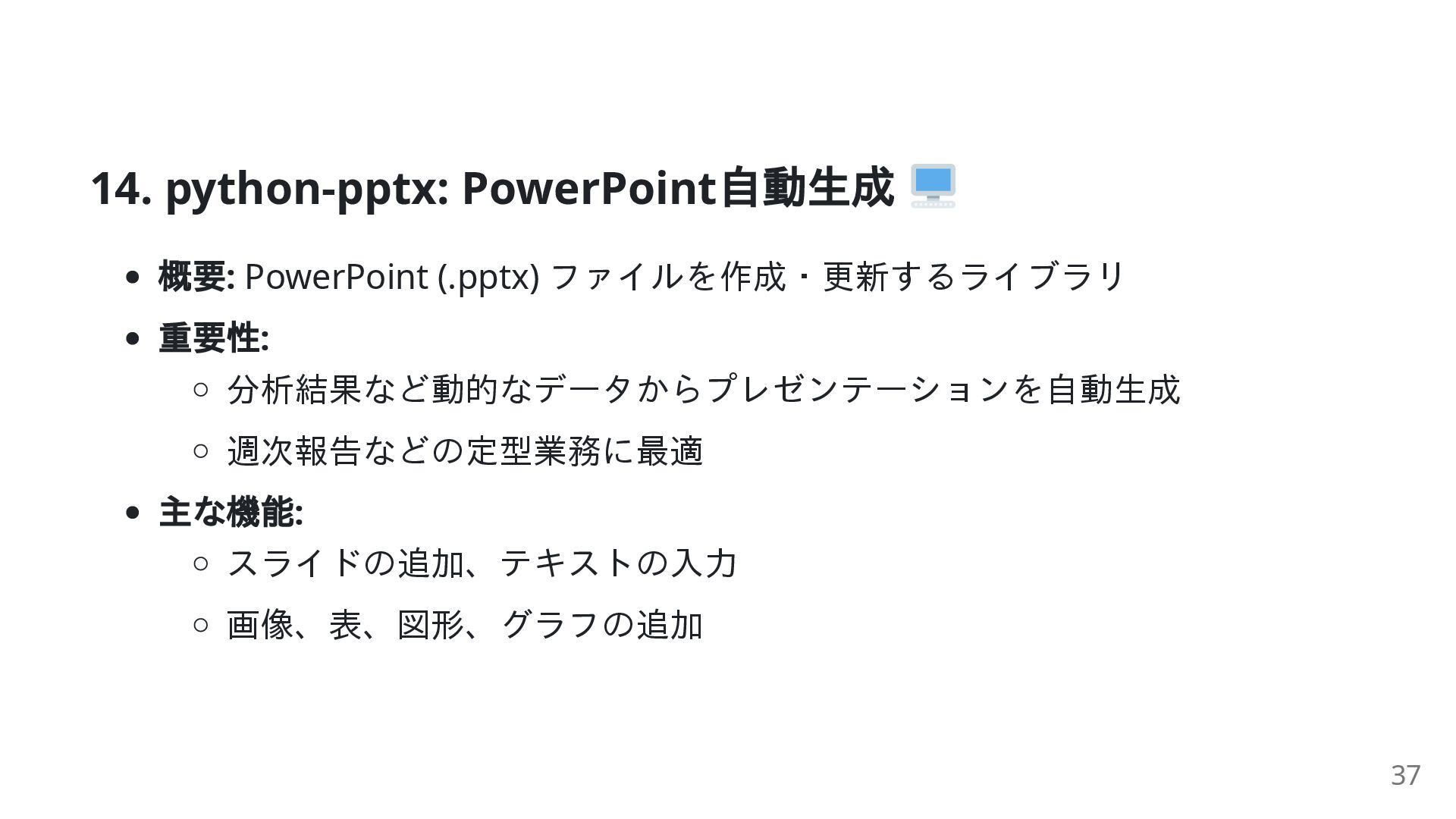 22. 14. python-pptx: PowerPoint 自動生成 概要: PowerPoint (.pptx) ファイルを作成・更新するライブラリ 重要性: 分析結果など動的なデータからプレゼンテーションを自動生成