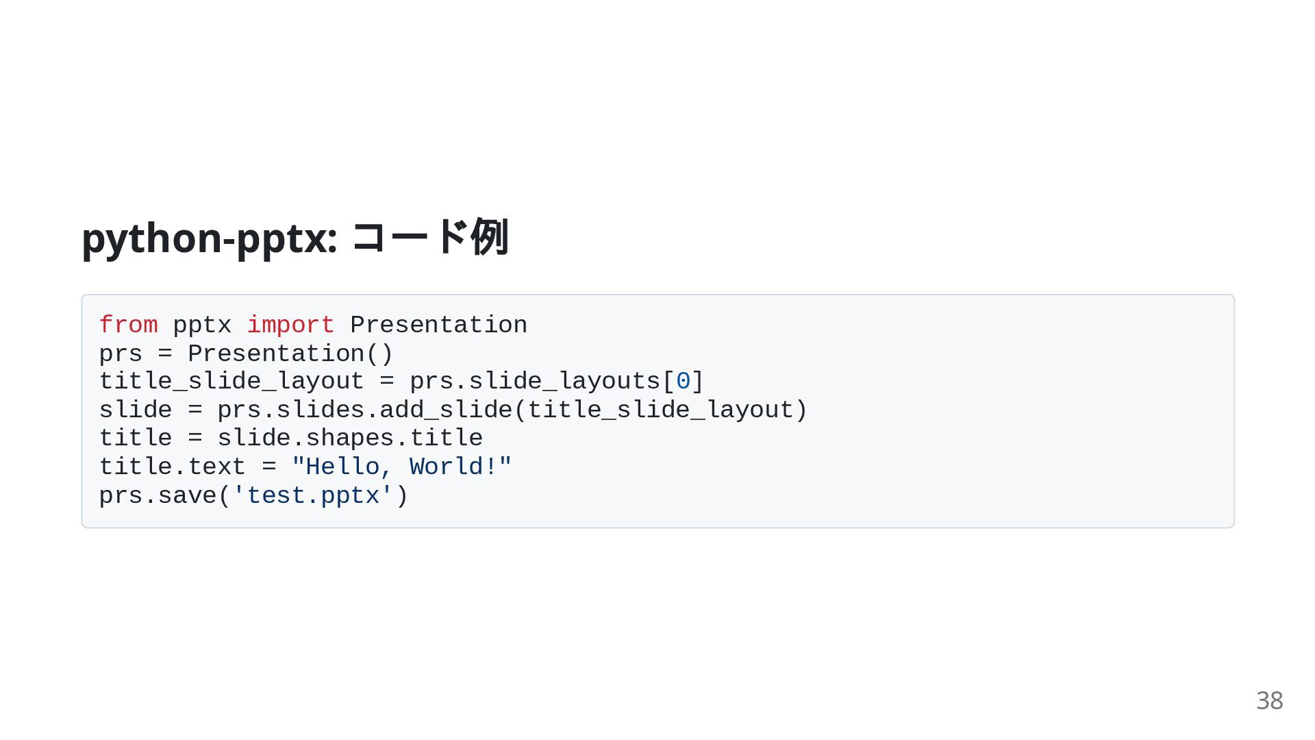 = prs.slide_layouts[0] slide = prs.slides.add_slide(title_slide_layout) title = slide.shapes.title title.text = "Hello, World!" prs.save('test.pptx') 38