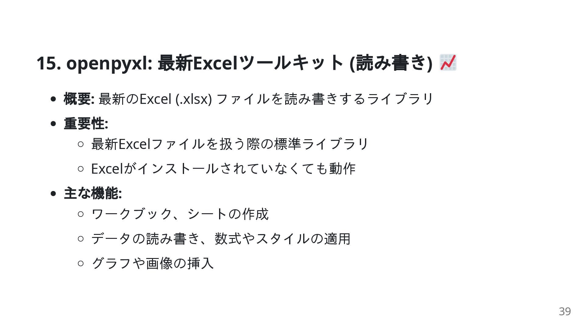 重要性: 最新Excelファイルを扱う際の標準ライブラリ Excelがインストールされていなくても動作 主な機能: ワークブック、シートの作成 データの読み書き、数式やスタイルの適用 グラフや画像の挿入 39