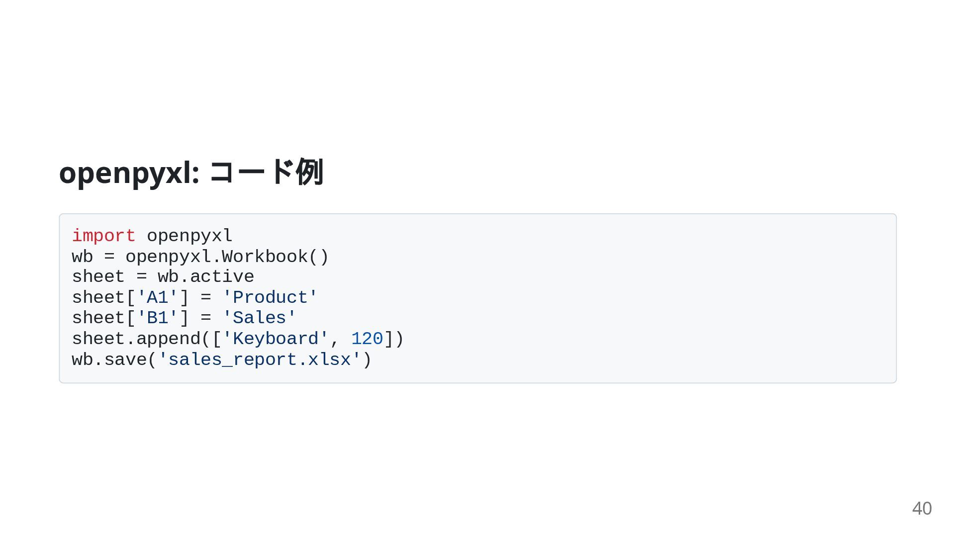 sheet['A1'] = 'Product' sheet['B1'] = 'Sales' sheet.append(['Keyboard', 120]) wb.save('sales_report.xlsx') 40