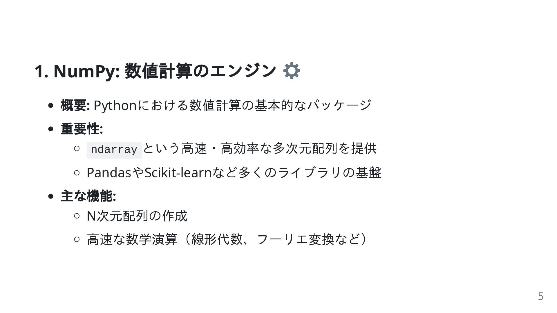 Matplotlib / SciPy (データ操作 / 可視化 / 高度な計算) numpy 上に構築 NumPy (高速な数値計算) C言語で書かれたパフォーマンス層 この階層構造が、 使いやすさと 高性能を両立させています。 4