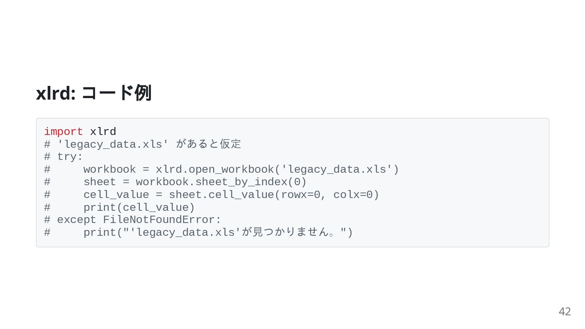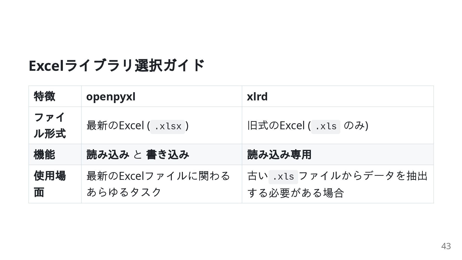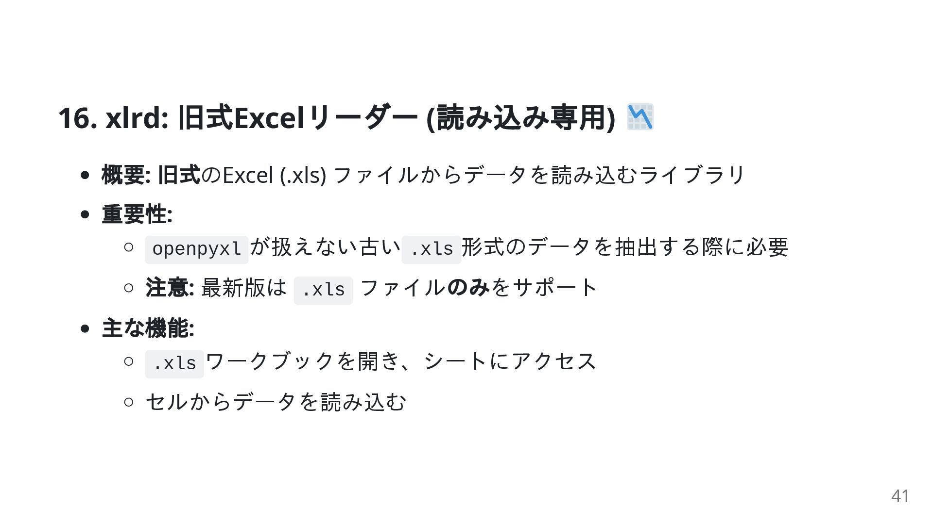 重要性: openpyxl が扱えない古い .xls 形式のデータを抽出する際に必要 注意: 最新版は .xls ファイル のみをサポート 主な機能: .xls ワークブックを開き、シートにアクセス セルからデータを読み込む 41