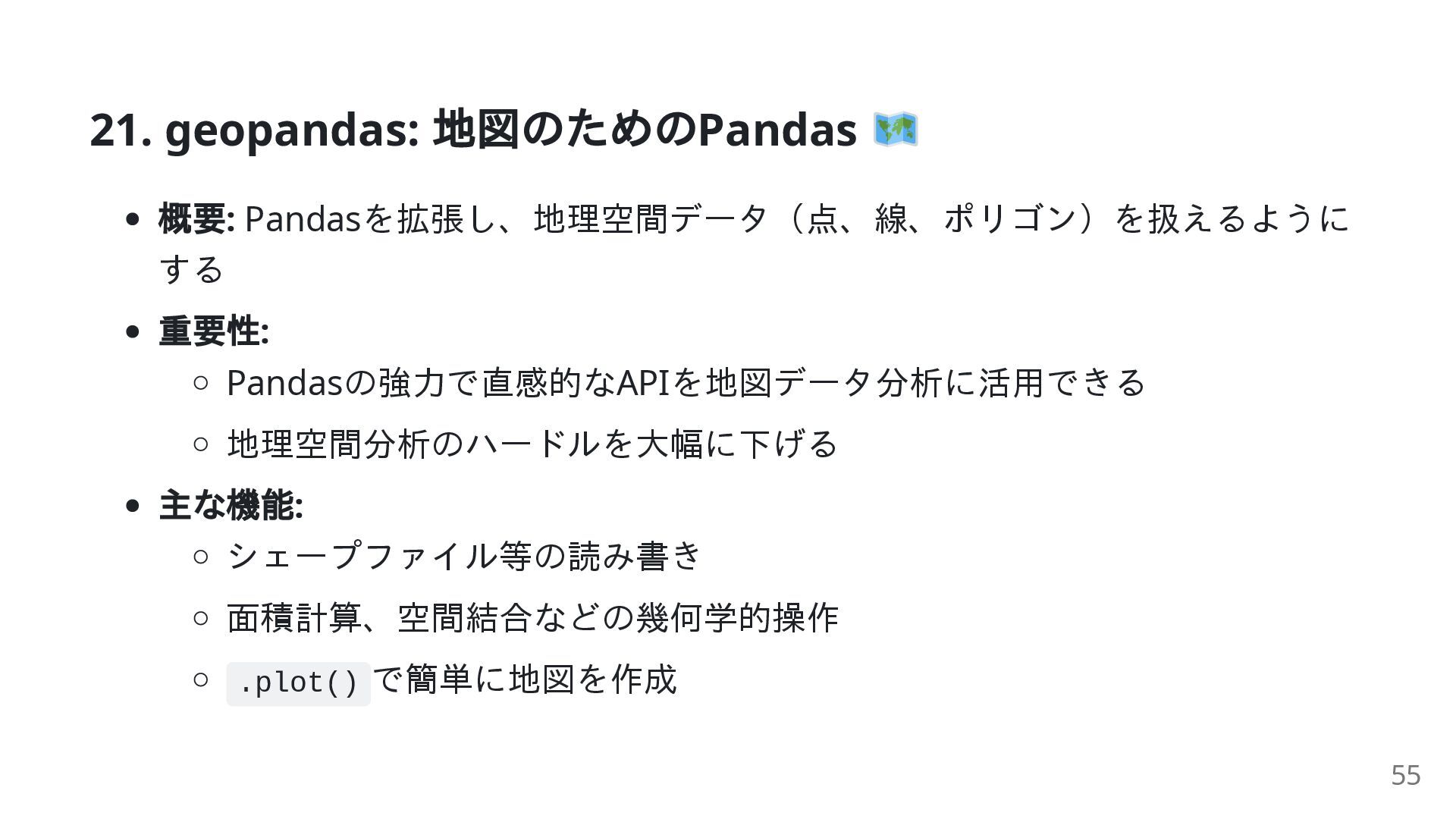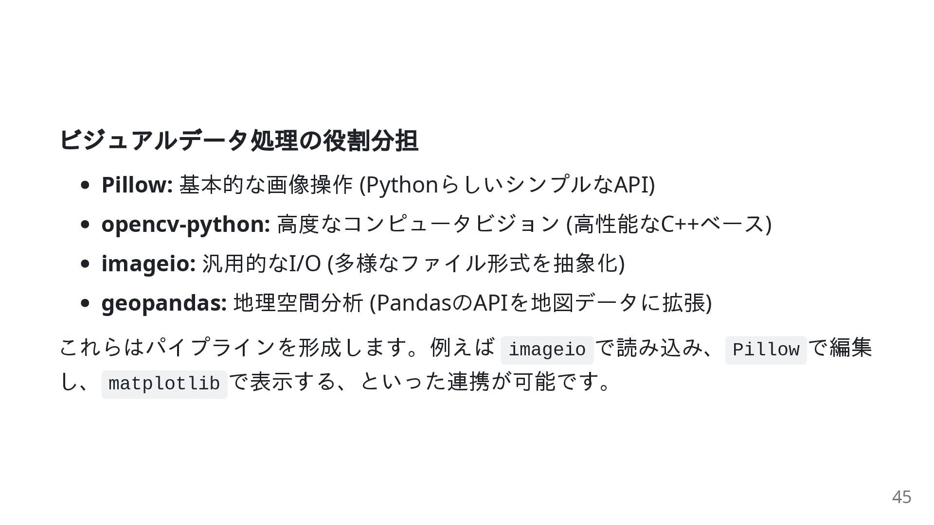 geopandas: 地理空間分析 (PandasのAPIを地図データに拡張) これらはパイプラインを形成します。例えば imageio で読み込み、 Pillow で編集 し、 matplotlib で表示する、といった連携が可能です。 45