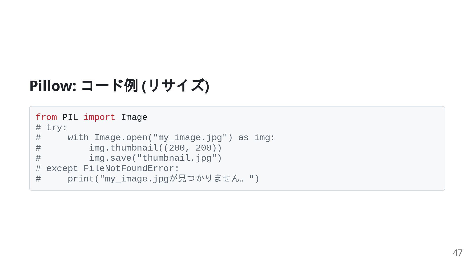 # with Image.open("my_image.jpg") as img: # img.thumbnail((200, 200)) # img.save("thumbnail.jpg") # except FileNotFoundError: # print("my_image.jpgが見つかりません。") 47
