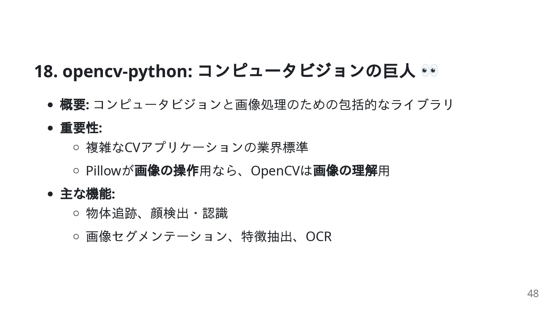 29. ビジュアルデータ処理の役割分担 Pillow: 基本的な画像操作 (PythonらしいシンプルなAPI) opencv-python: 高度なコンピュータビジョン (高性能なC++ベース) imageio: 汎用的なI/O (多様なファイル形式を抽象化)