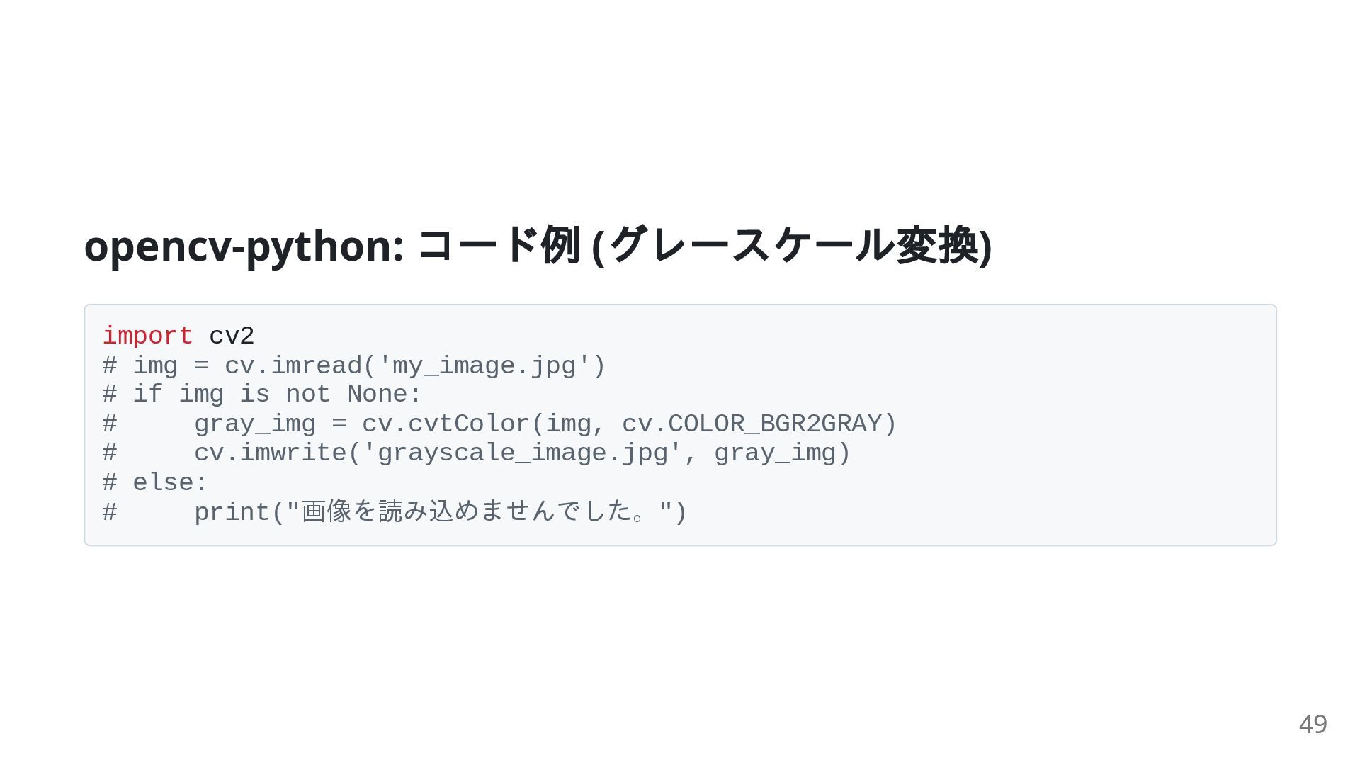 31. opencv-python: コード例 ( グレースケール変換) import cv2 # img = cv.imread('my_image.jpg')
