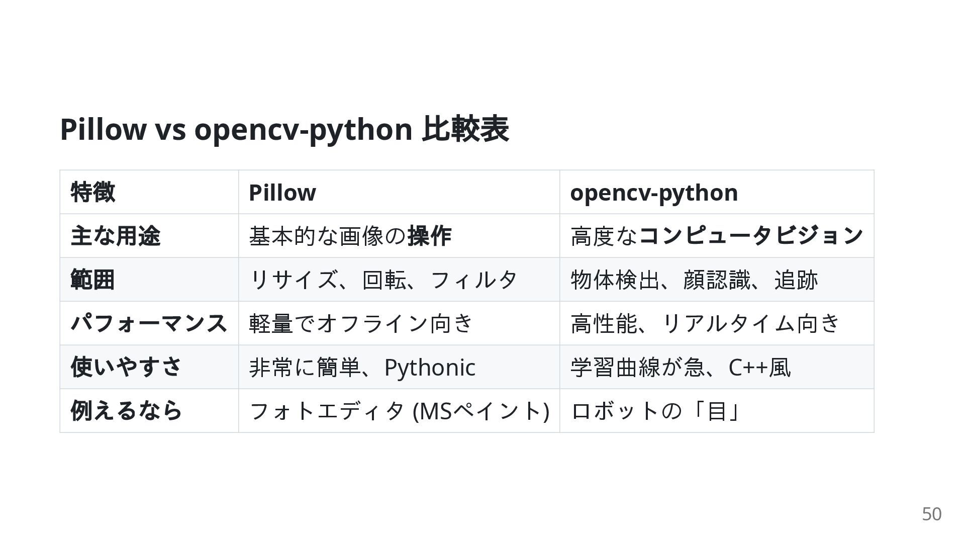 高度な コンピュータビジョン 範囲 リサイズ、回転、フィルタ 物体検出、顔認識、追跡 パフォーマンス 軽量でオフライン向き 高性能、リアルタイム向き 使いやすさ 非常に簡単、Pythonic 学習曲線が急、C++風 例えるなら フォトエディタ (MSペイント) ロボットの「目」 50