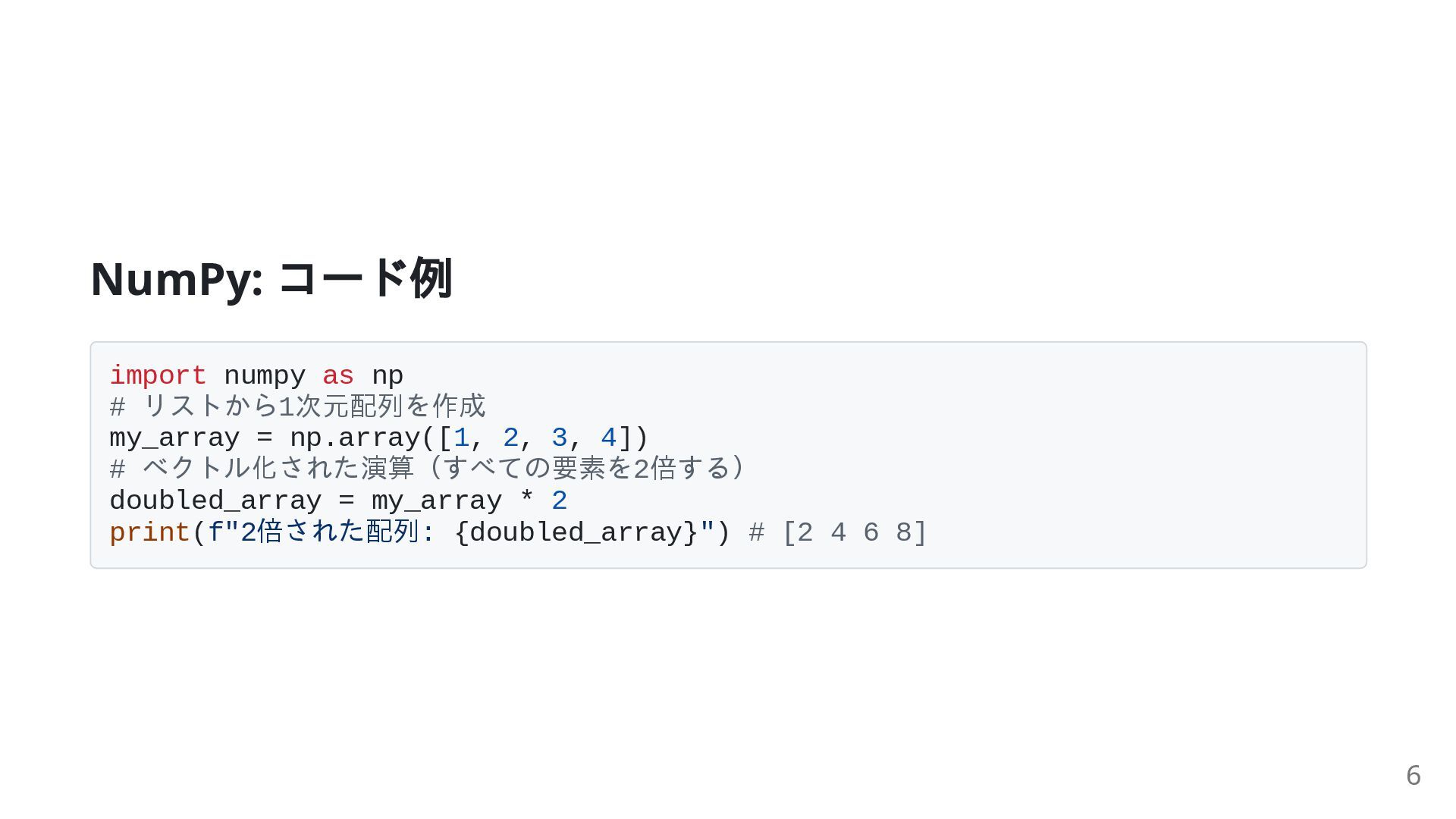 np.array([1, 2, 3, 4]) # ベクトル化された演算(すべての要素を2倍する) doubled_array = my_array * 2 print(f"2倍された配列: {doubled_array}") # [2 4 6 8] 6