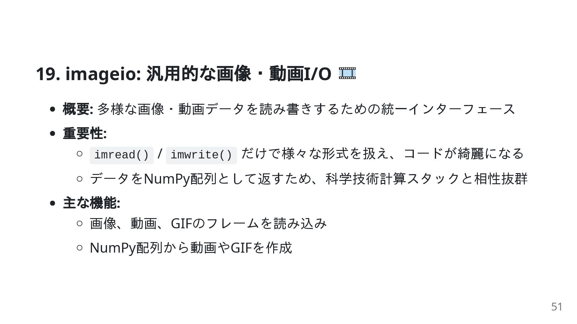 データをNumPy配列として返すため、科学技術計算スタックと相性抜群 主な機能: 画像、動画、GIFのフレームを読み込み NumPy配列から動画やGIFを作成 51