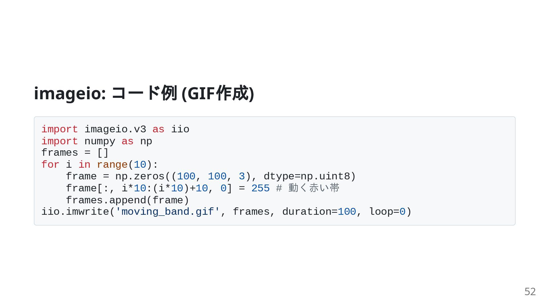 34. imageio: コード例 (GIF 作成) import imageio.v3 as iio import numpy