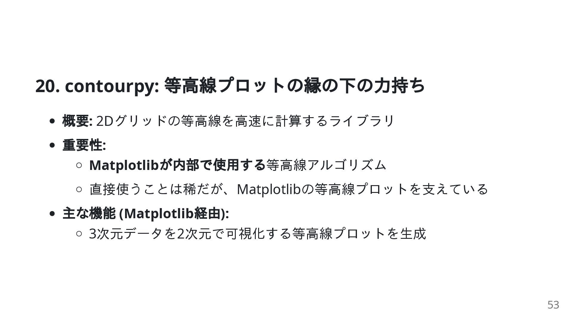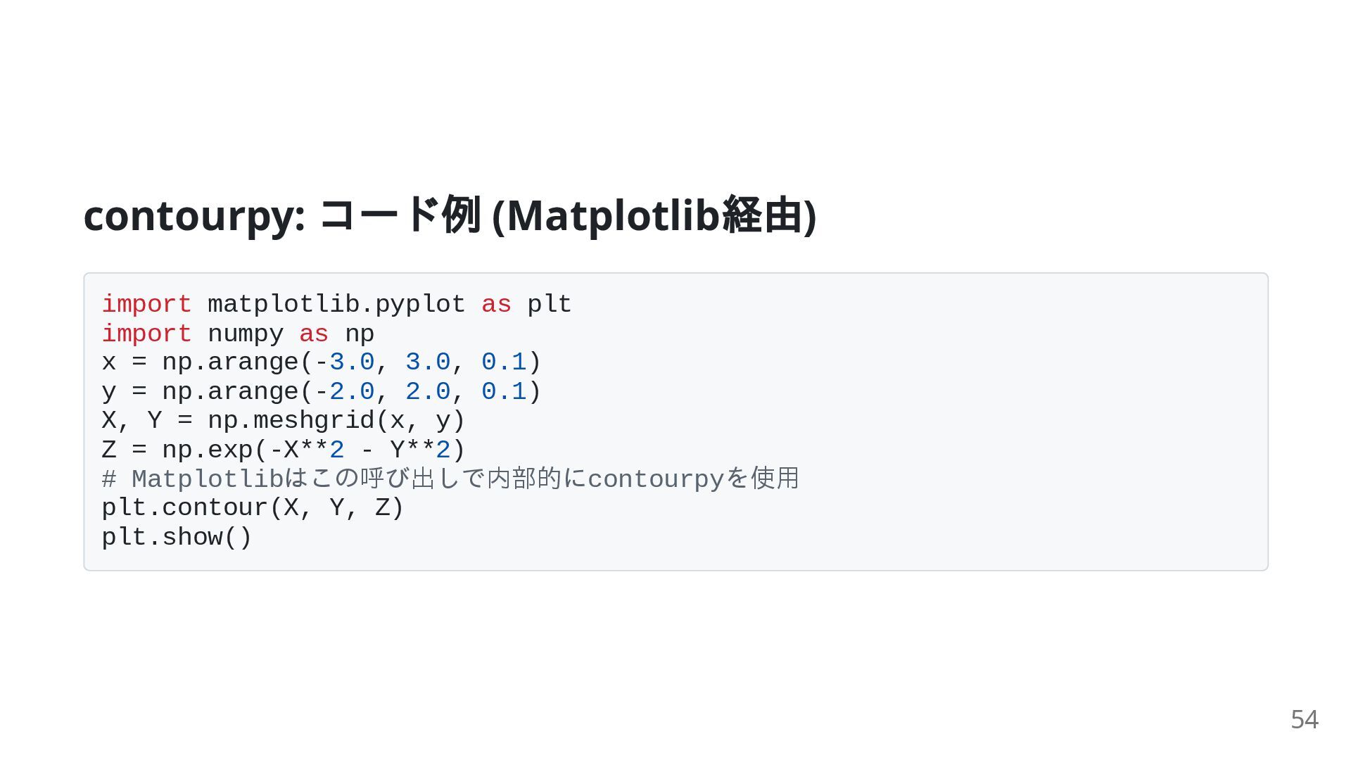35. contourpy: コード例 (Matplotlib 経由) import matplotlib.pyplot as plt import numpy