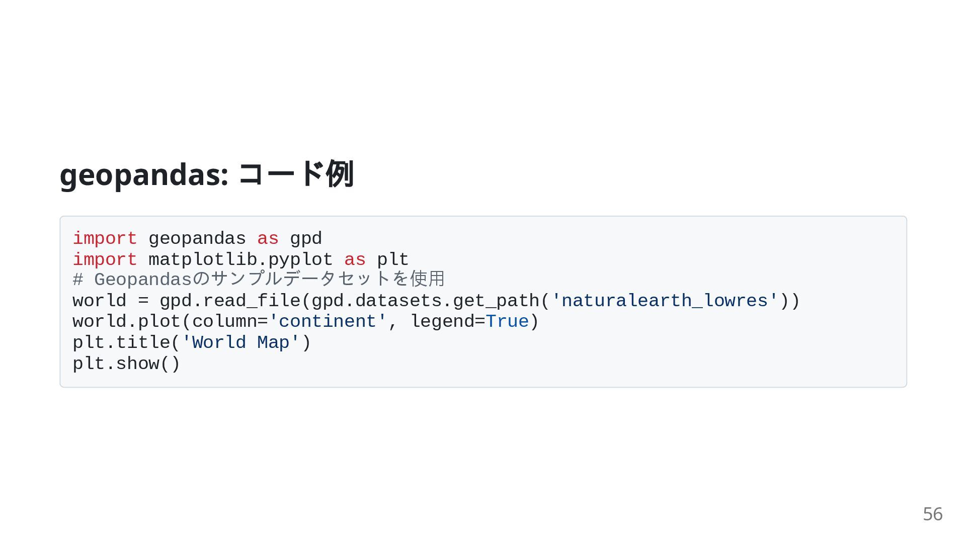 36. geopandas: コード例 import geopandas as gpd import matplotlib.pyplot as plt