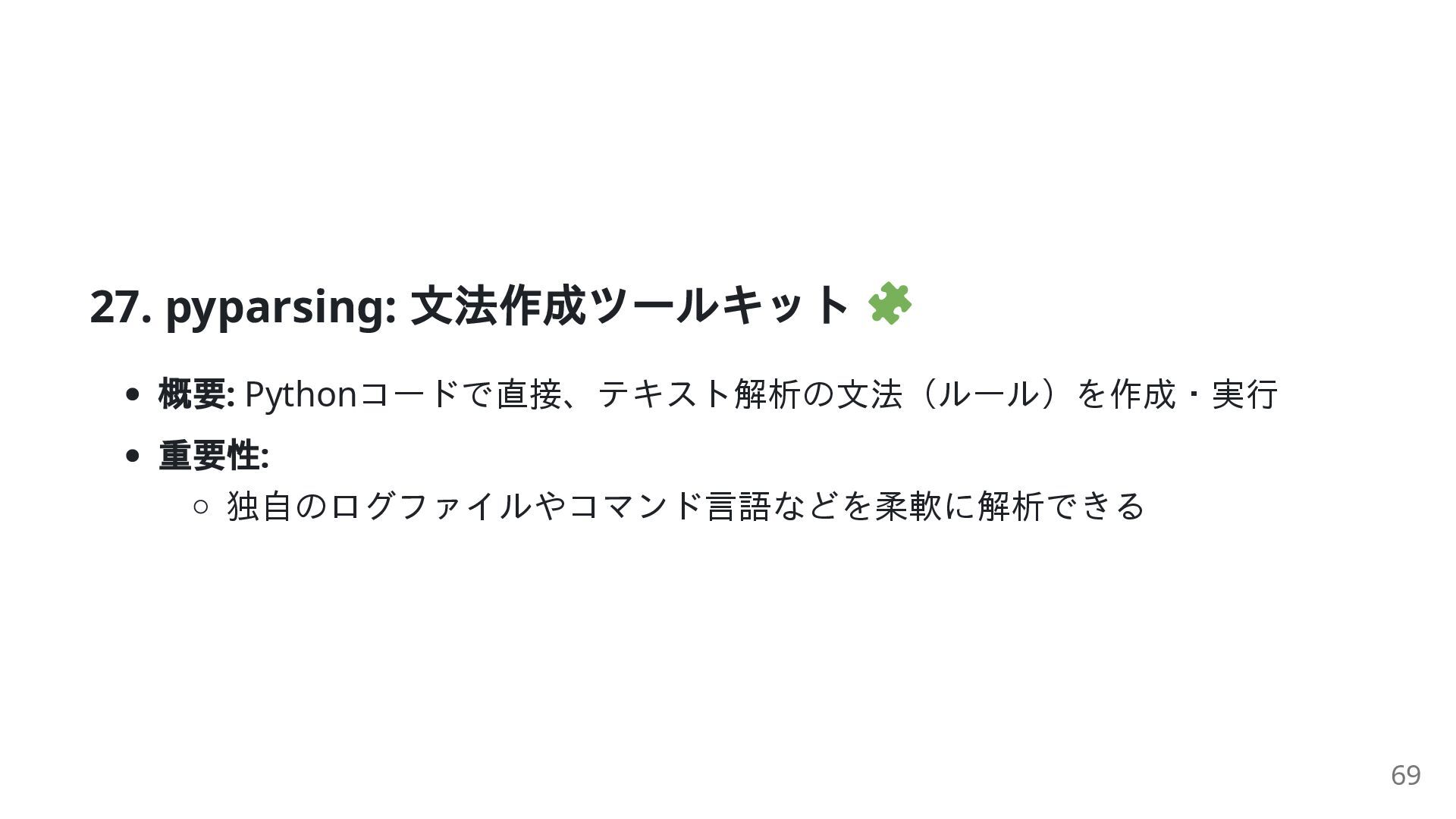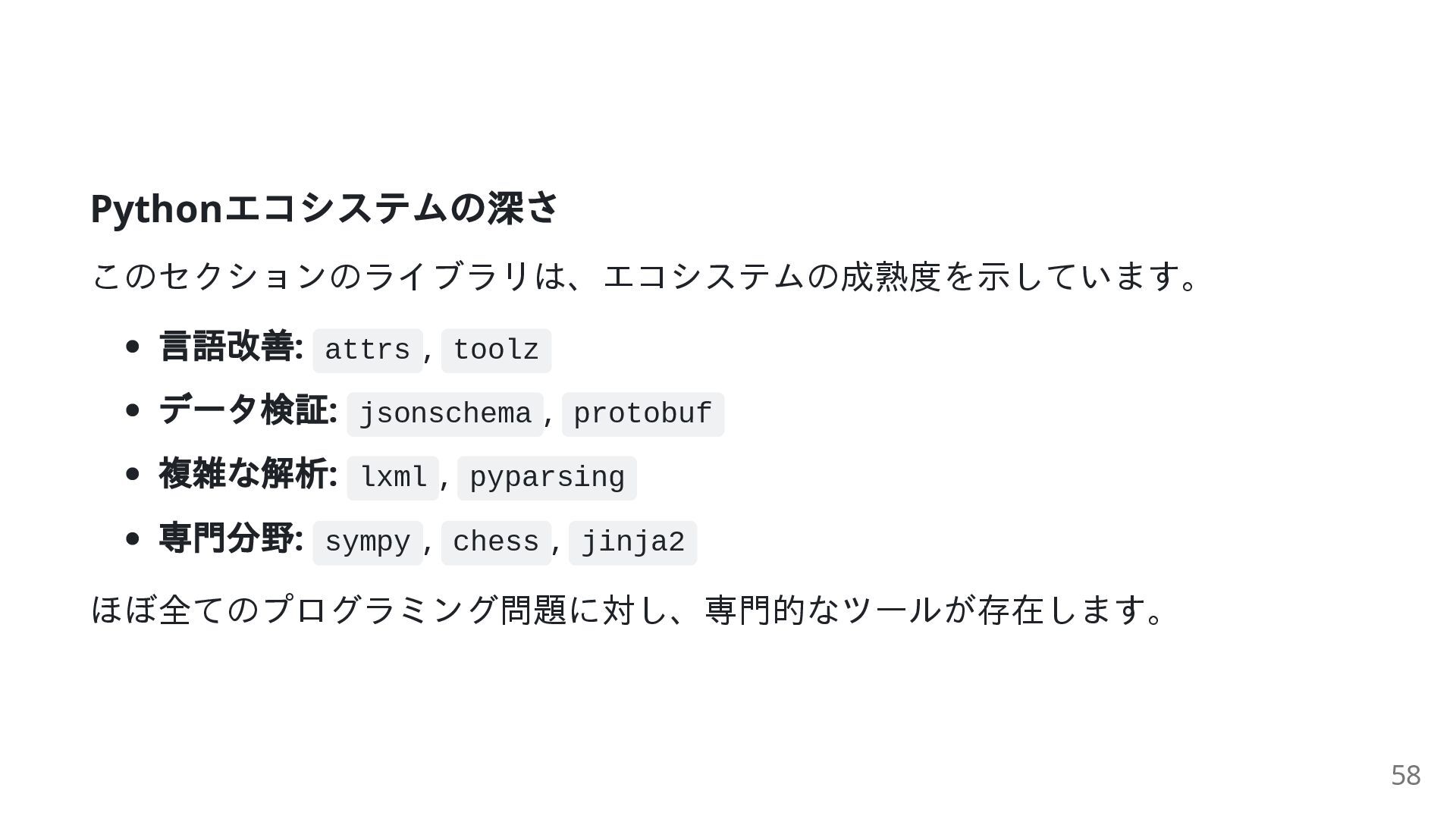 protobuf 複雑な解析: lxml , pyparsing 専門分野: sympy , chess , jinja2 ほぼ全てのプログラミング問題に対し、専門的なツールが存在します。 58