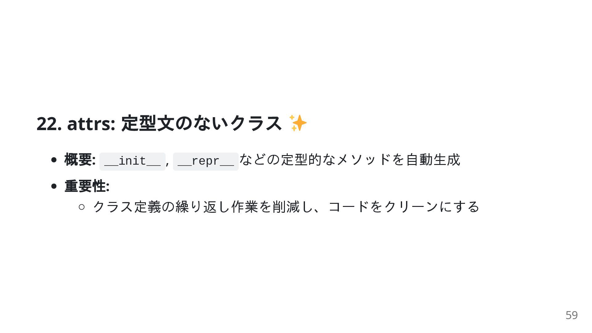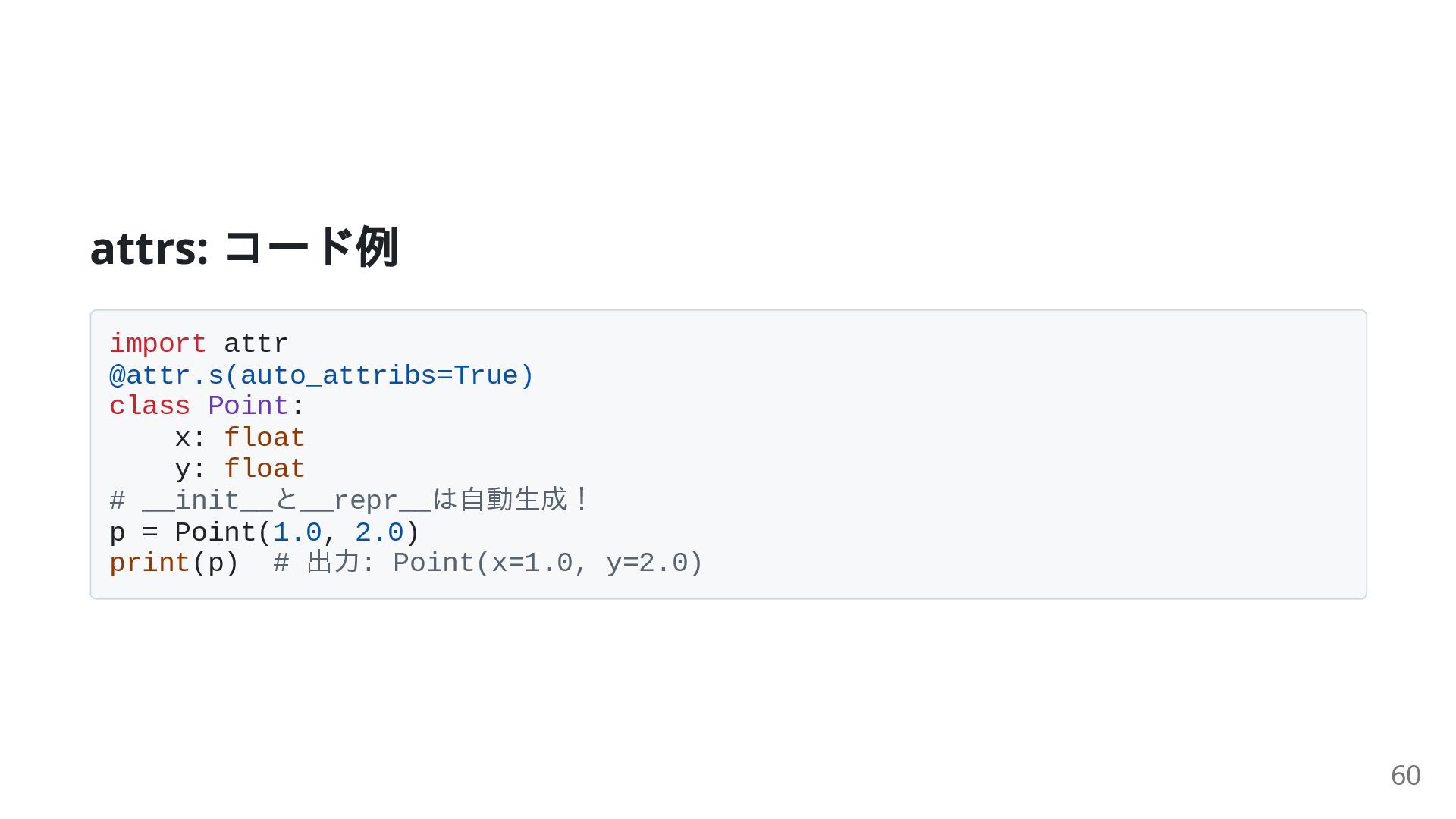 float # __init__と__repr__は自動生成! p = Point(1.0, 2.0) print(p) # 出力: Point(x=1.0, y=2.0) 60