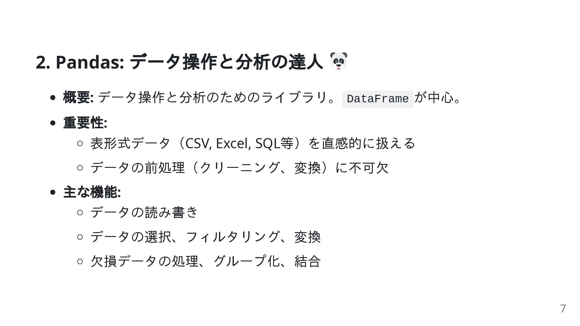 SQL等)を直感的に扱える データの前処理(クリーニング、変換)に不可欠 主な機能: データの読み書き データの選択、フィルタリング、変換 欠損データの処理、グループ化、結合 7