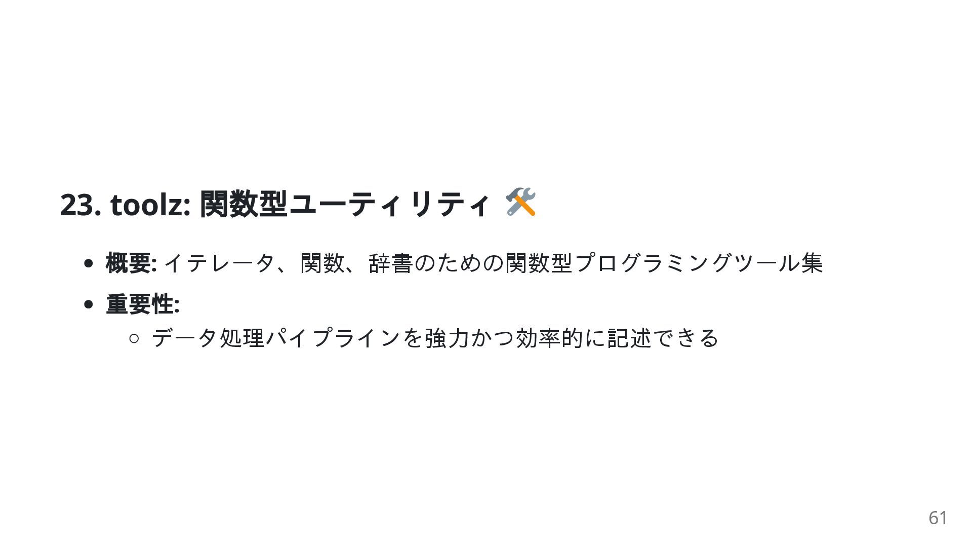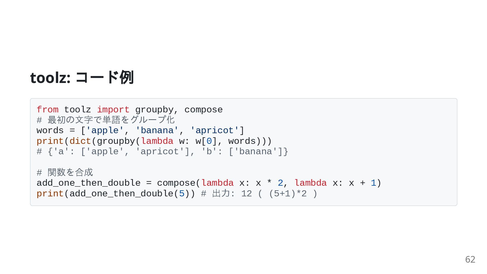 = ['apple', 'banana', 'apricot'] print(dict(groupby(lambda w: w[0], words))) # {'a': ['apple', 'apricot'], 'b': ['banana']} # 関数を合成 add_one_then_double = compose(lambda x: x * 2, lambda x: x + 1) print(add_one_then_double(5)) # 出力: 12 ( (5+1)*2 ) 62